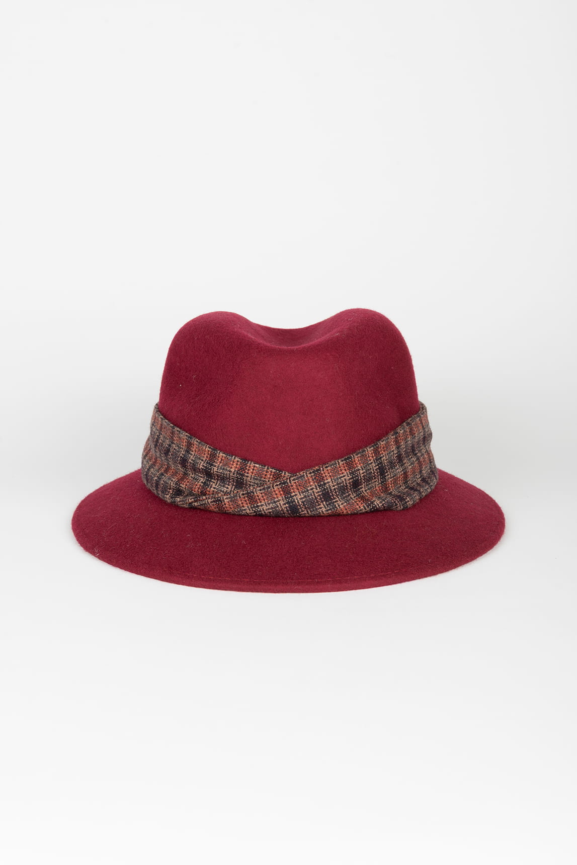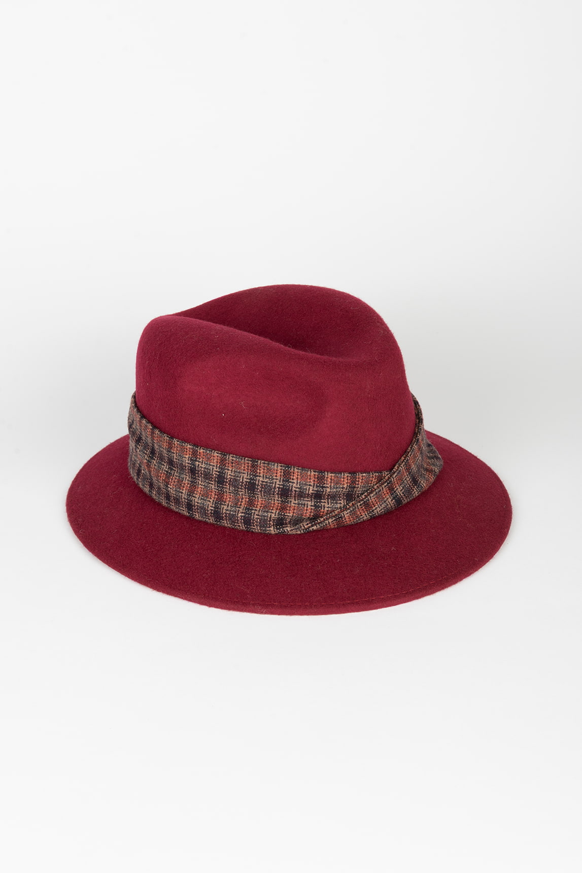 - Sombrero de fieltro con copa tipo fedora y ala media.
