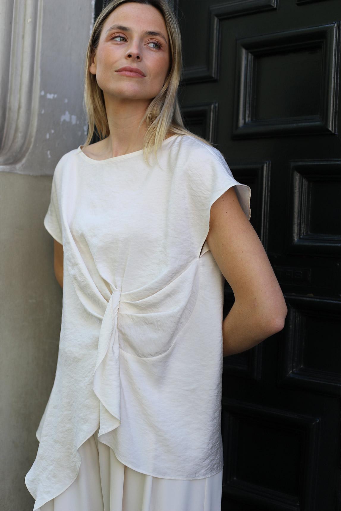 Women's ecru blouse with a round neckline, dropped short sleeves, and a flowing silhouette. The design stands out for its side draping with a knot effect, which gently gathers the fabric and creates an asymmetrical hem, providing movement and a very flattering, flowing line. The surface has a smooth finish with a slight visual texture, reinforcing a clean, elegant, and modern image.