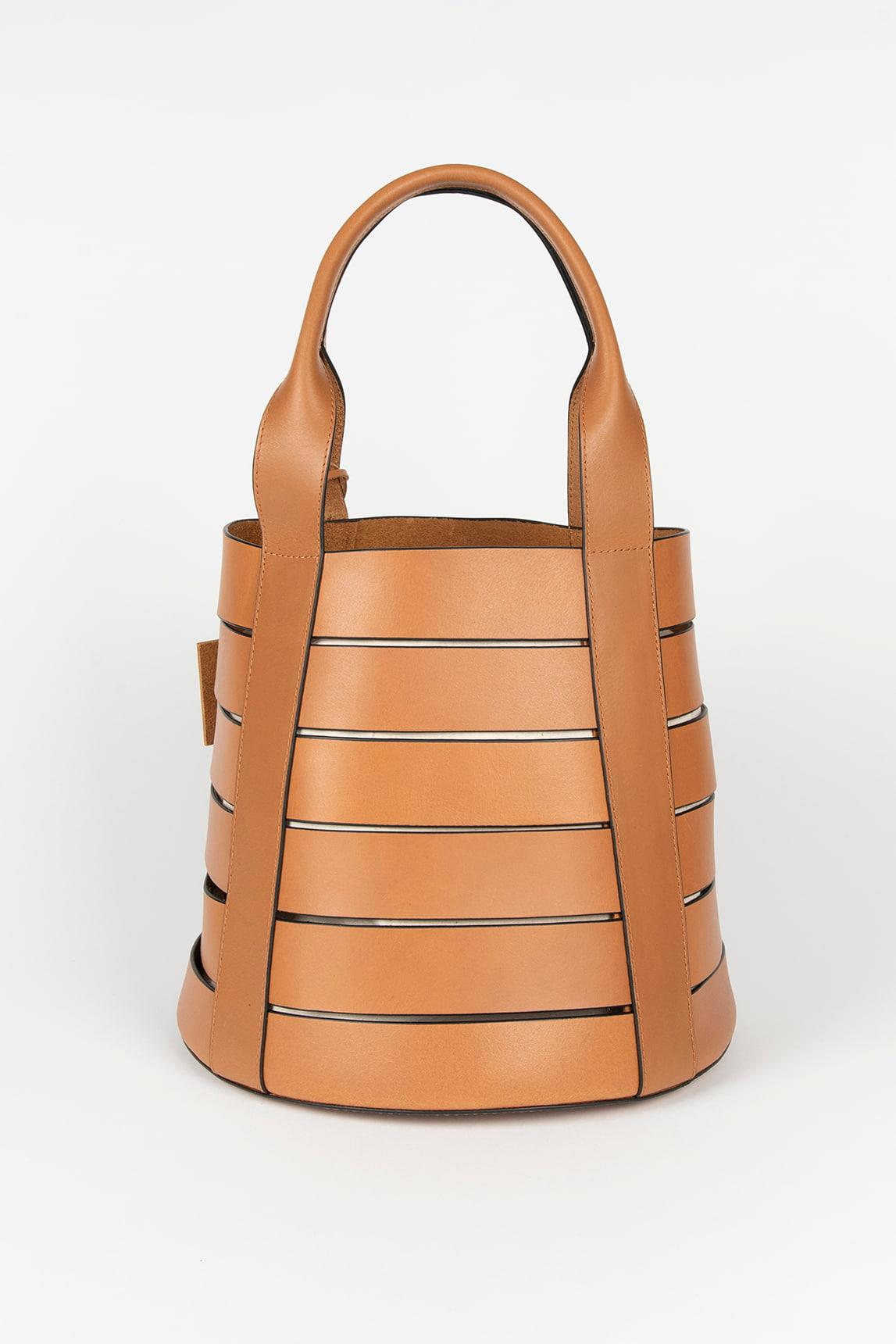 This leather handbag, in a warm and luminous tan color, enhances the natural finish of the leather and adds personality to any outfit. Its structured bucket design with horizontal bands creates a modern and instantly recognizable architectural effect. The long handles allow you to carry it comfortably over your shoulder or in your hand, adding elegance and sturdiness to the overall look. Its cylindrical structure maintains its shape without sacrificing lightness, making it a versatile bag for both everyday use and special occasions. Measuring 17 x 12 x 10.5 cm with a 7 x 5.5 cm handle, it offers ample interior space without being bulky. It's ideal for those seeking a unique, structured leather bag that stands out from classic styles. A bucket-style leather bag that combines contemporary design and functionality. We strive to display colors as accurately as possible, but they may vary slightly from reality.