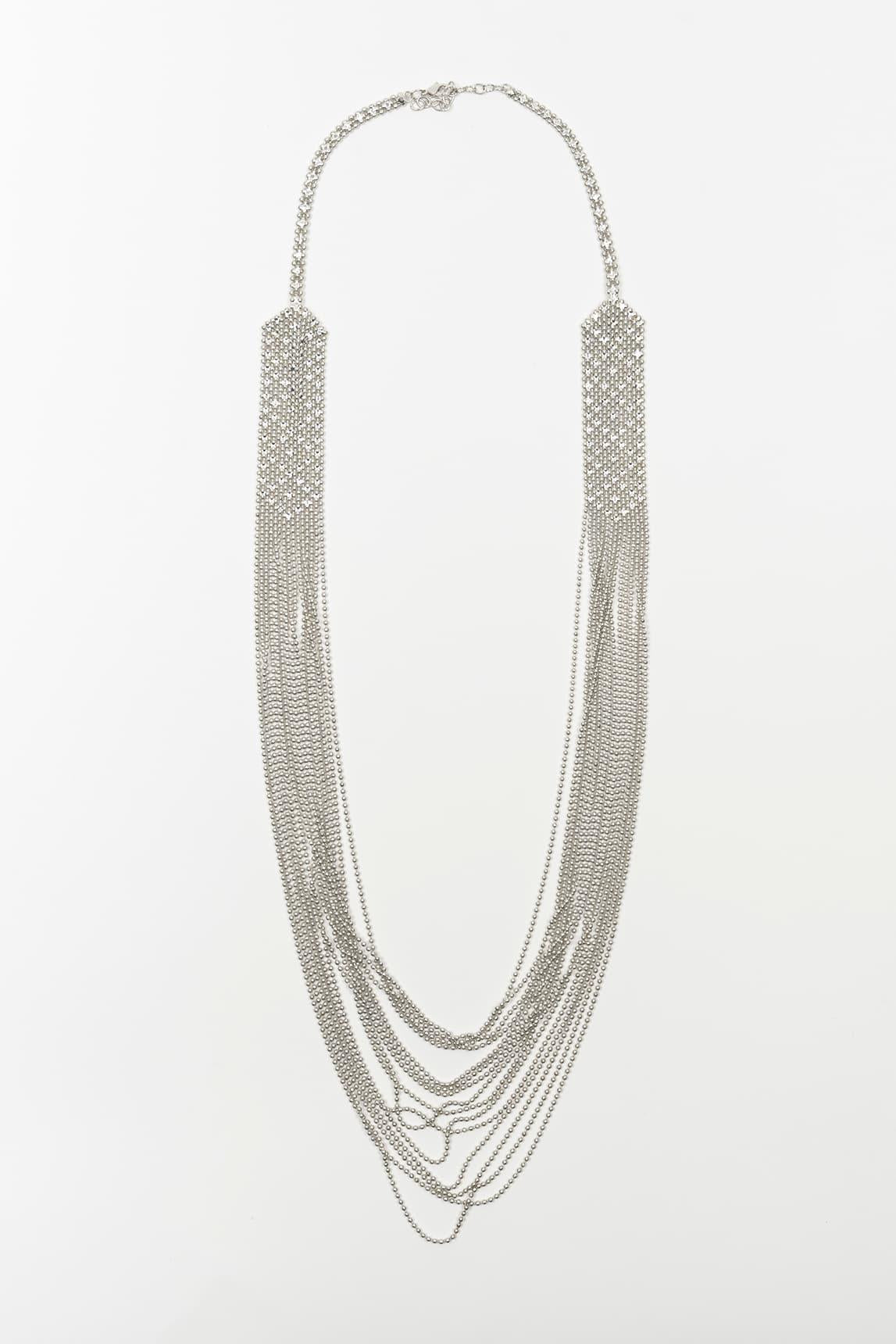 El collar Valeris en plata destaca por su diseño largo y sofisticado compuesto por múltiples cadenas finas en caída escalonada que generan un efecto fluido y elegante. Las piezas laterales estructuradas aportan equilibrio y enmarcan la composición, creando una silueta armoniosa y contemporánea.