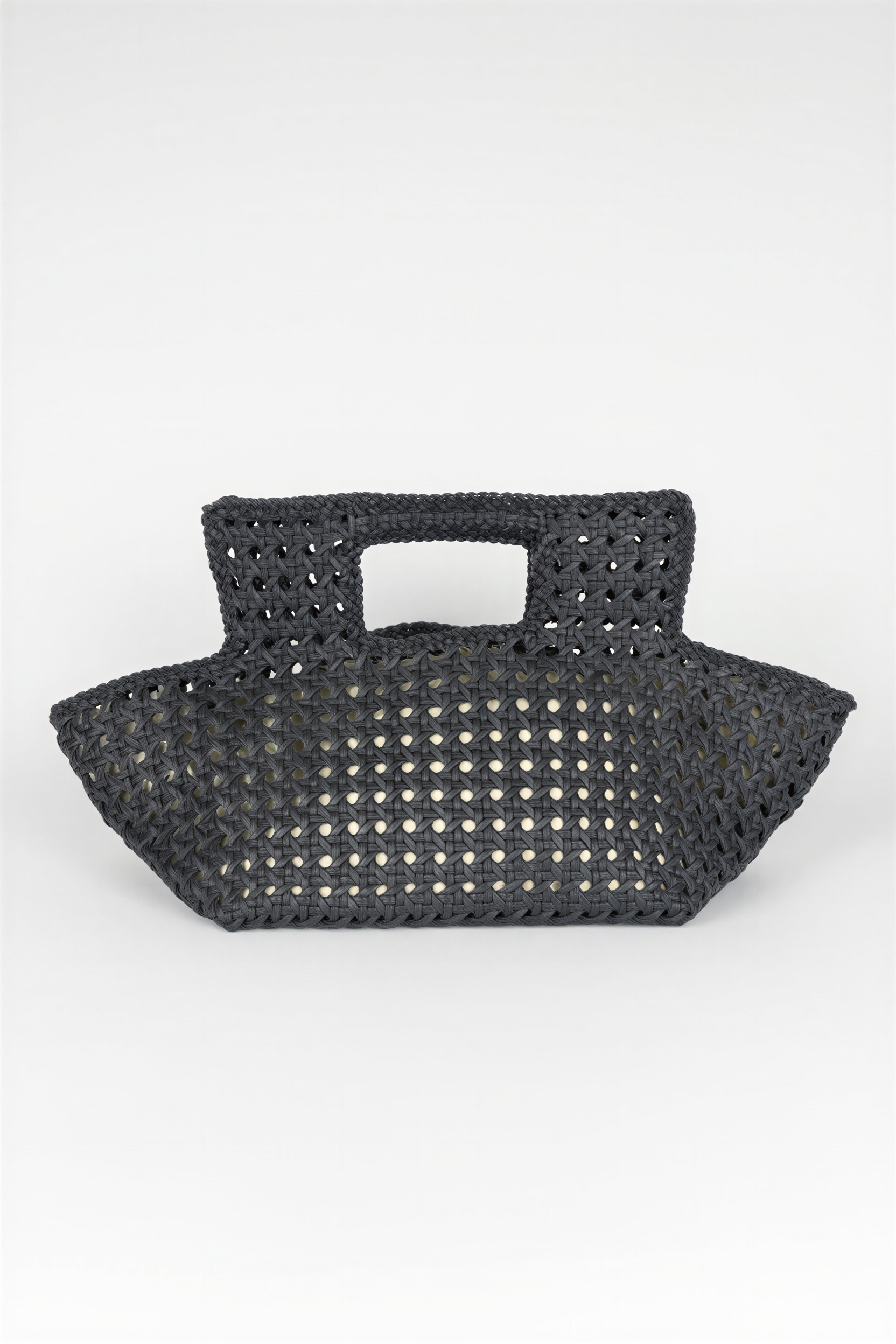 El trenzado integral realza la profundidad del color y aporta dinamismo visual, mientras que su estructura compacta mantiene proporciones equilibradas. Las asas integradas refuerzan su diseño minimalista y arquitectónico.