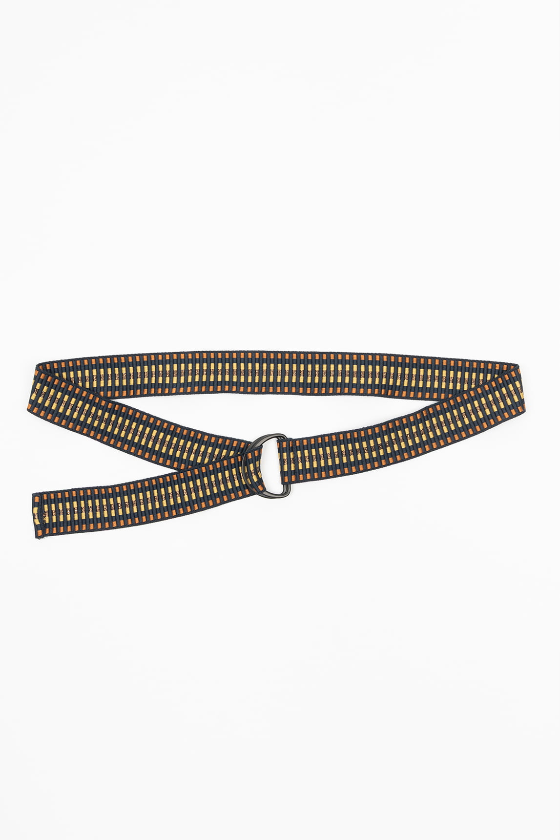 - Belt with vertical stripe design in mustard, orange and beige tones.