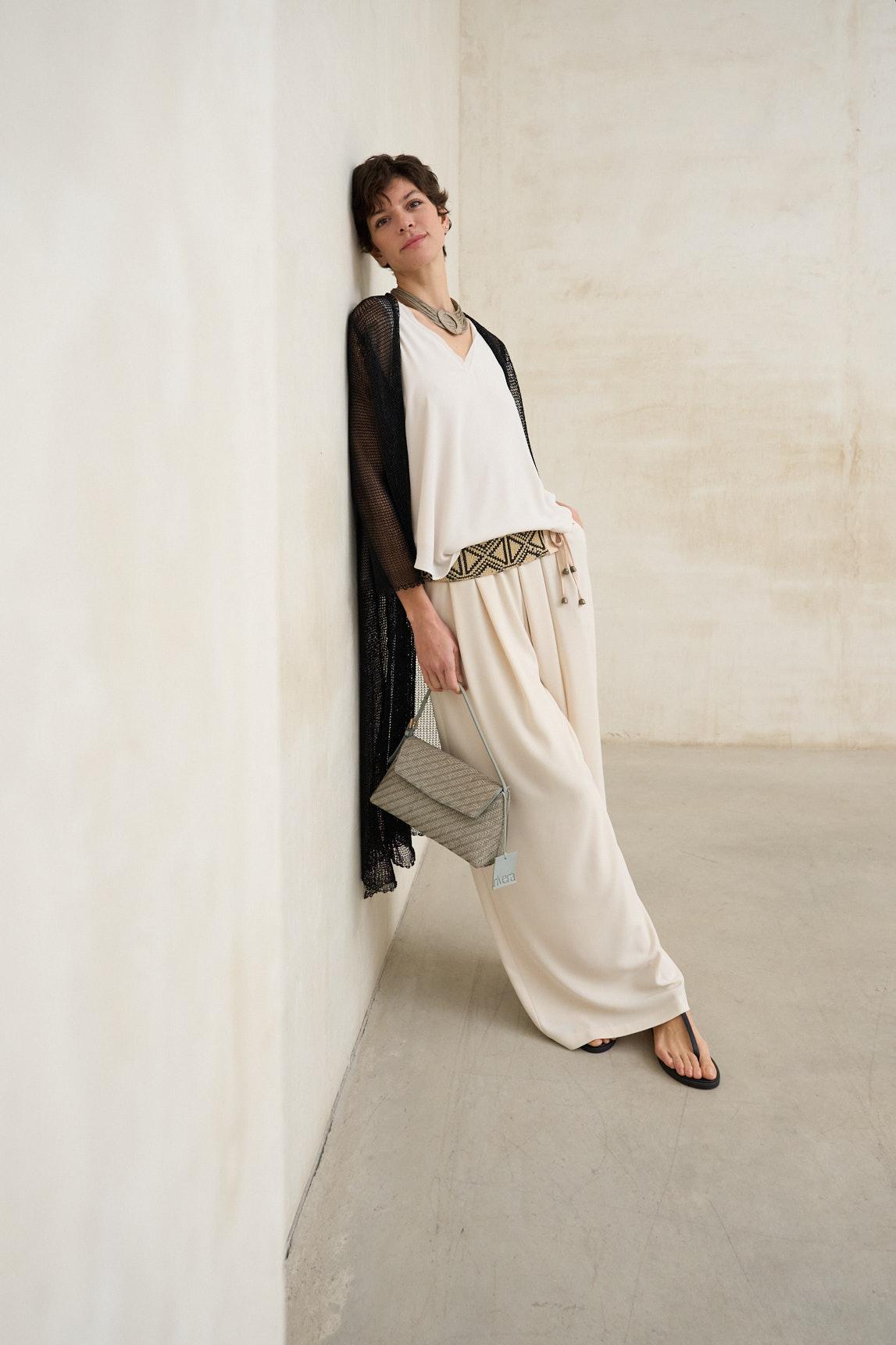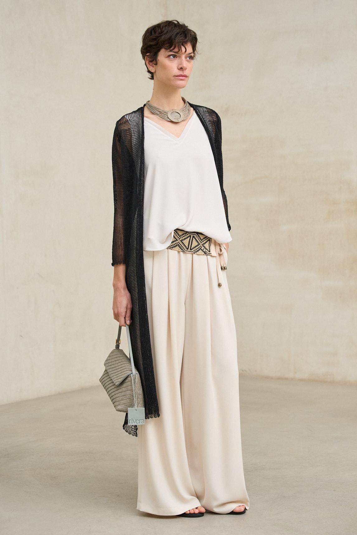 The Avenel black knit coat is a light and airy piece crafted from open-knit fabric with a textured, openwork design that adds visual depth and movement. Its long, open design flatters the figure, creating an elegant and fluid vertical line. The knit fabric is subtly translucent, allowing for layering and contrasting looks. For a clean, balanced finish, we recommend pairing it with a basic top like the off-white Alenia Top (not included). The three-quarter sleeves and soft drape enhance its sophisticated and contemporary character. In black, it takes on a more striking and versatile presence, ideal for monochromatic looks or for layering over light tones to create contrast. Perfect for elevating simple outfits with a light and refined touch. We strive to display colors as accurately as possible, but they may vary slightly from reality.