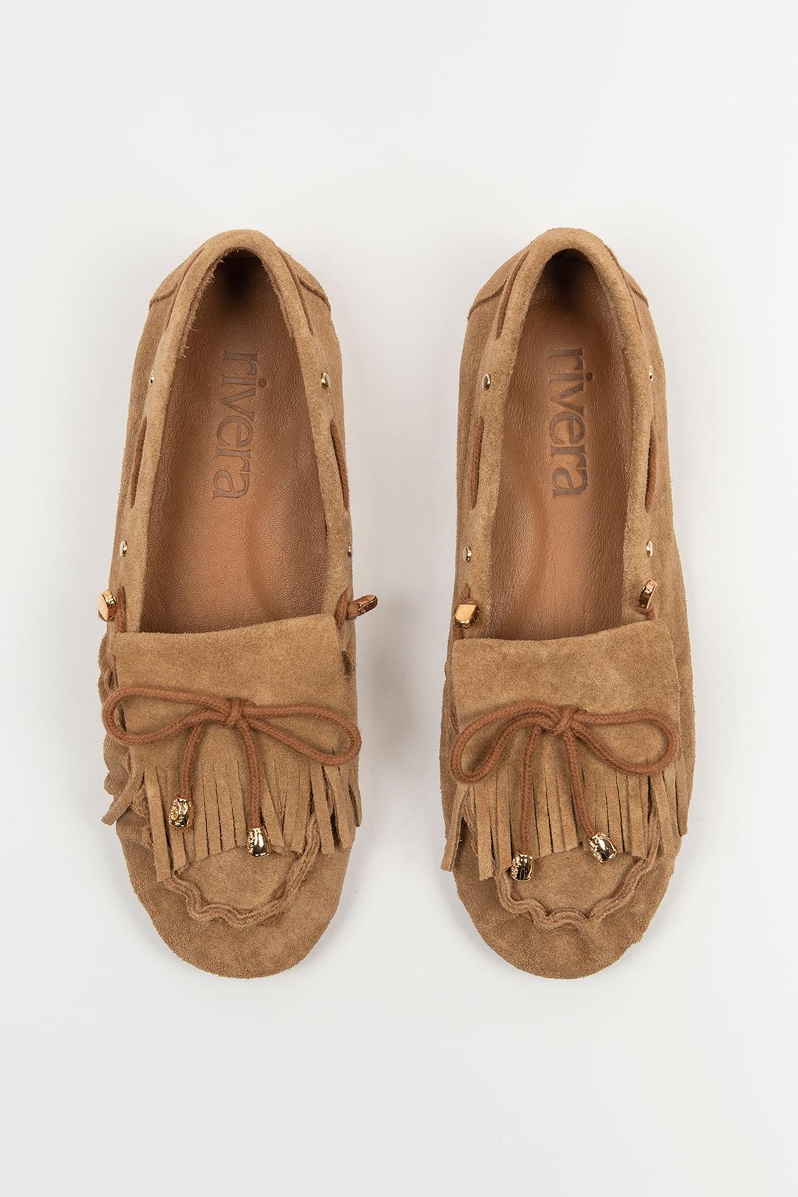 The Flecco camel loafer reinterprets the classic loafer with a relaxed and characterful design. It stands out for its fringe detail on the vamp and the decorative bow with metallic tips, elements that add movement and a handcrafted touch to the overall look.