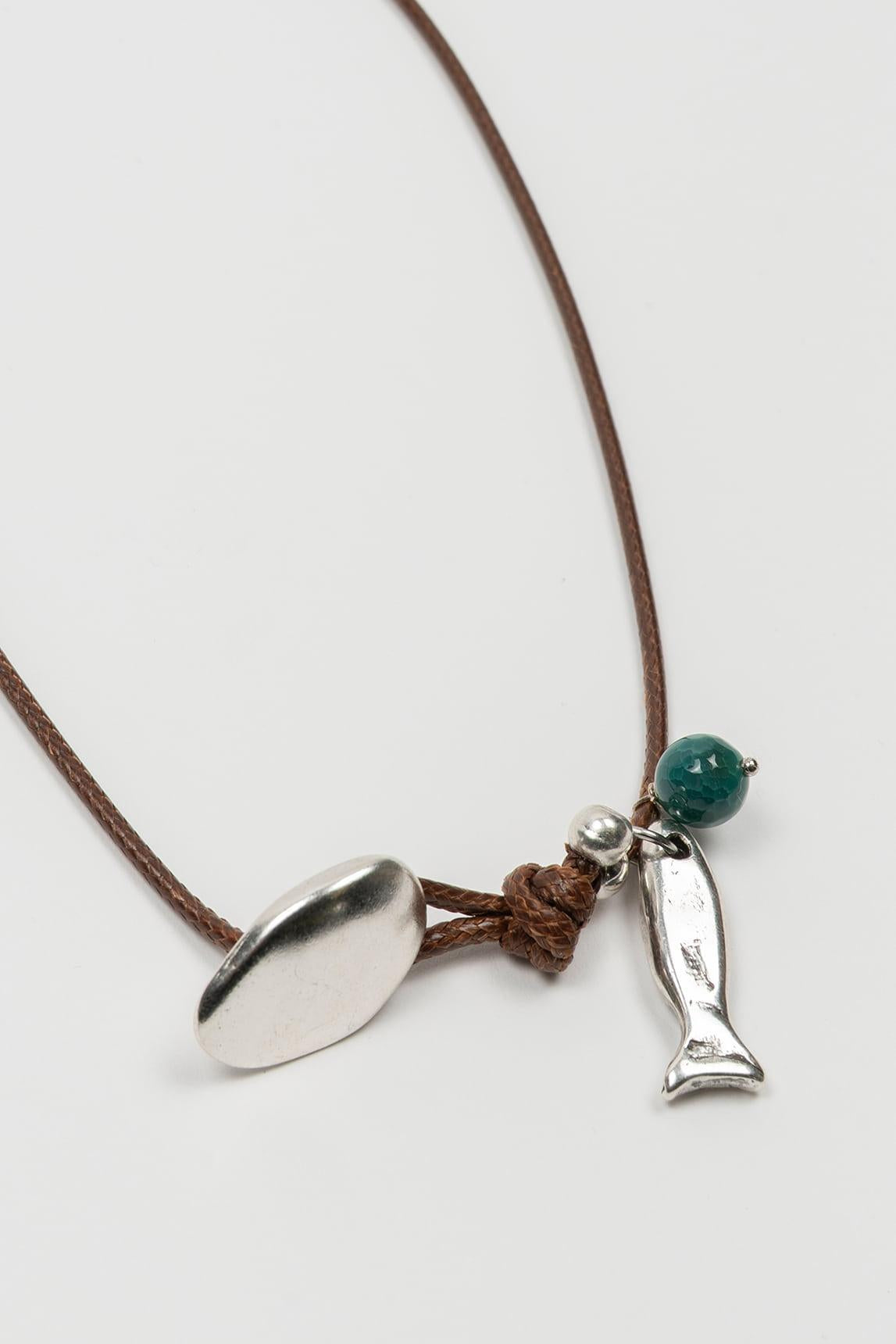 The Elaris silver choker maintains the same delicate structure and includes two zamak pieces—a button and a fish, both sterling silver plated—along with an agate stone. Its delicate design balances simplicity and detail, creating a light yet distinctive piece.