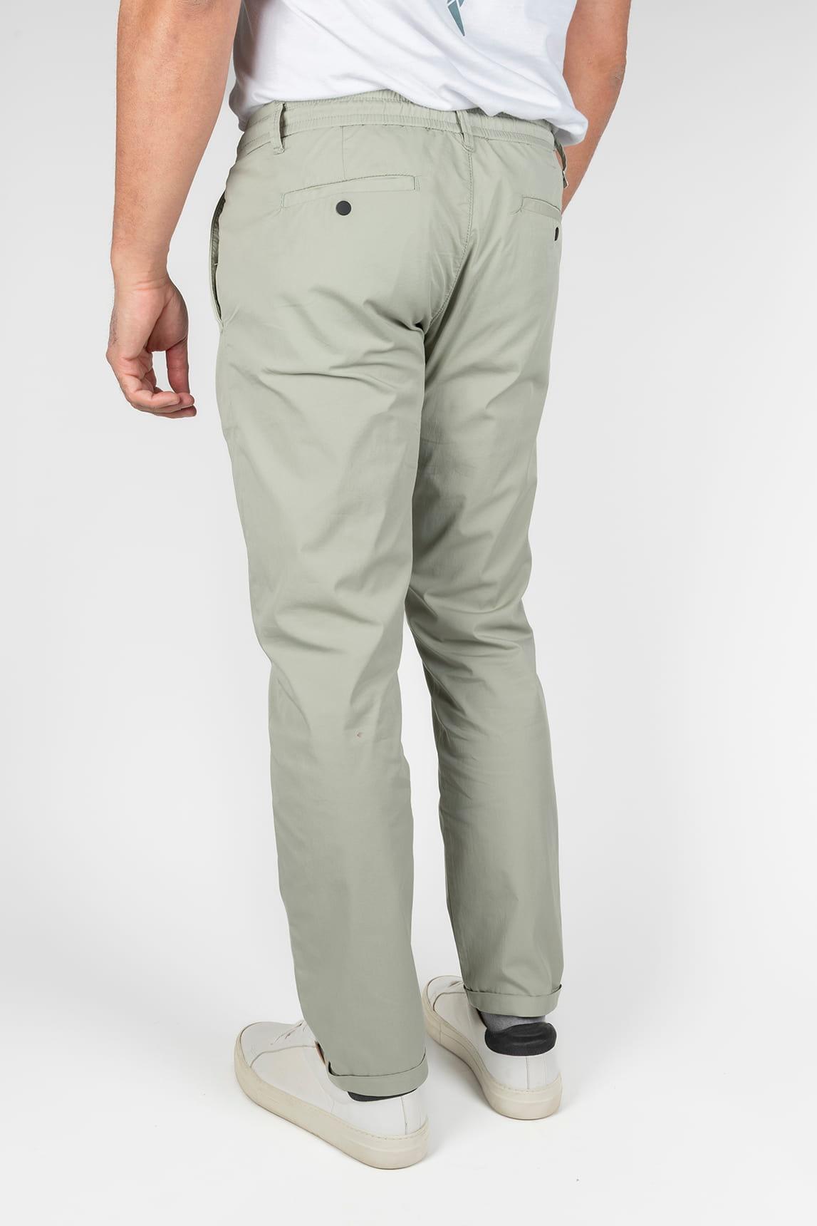 These sage-colored pants feature a clean aesthetic with a long, straight leg that naturally adapts to movement. The elastic waistband with adjustable drawstring is visibly integrated, adding a functional nuance that reinforces their relaxed character. The design is completed with side pockets and a clean front that maintains a tidy appearance, while the smooth-looking fabric with a light structure offers a balanced and continuous drape.