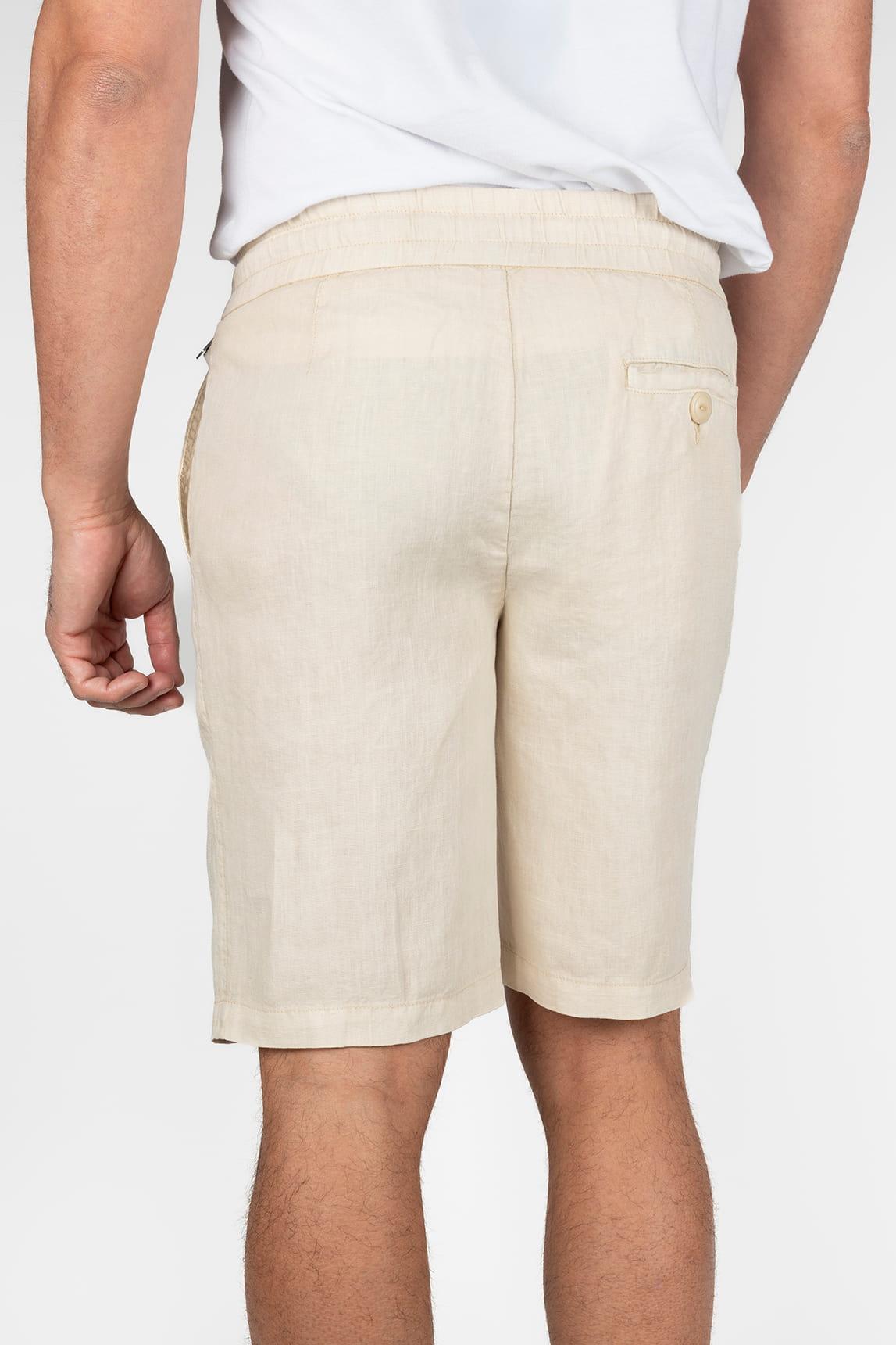 Esta bermuda en tono crudo presenta un diseño limpio y relajado, con largo por encima de la rodilla y una silueta recta que favorece la comodidad. La cintura elástica con cordón ajustable se muestra como un detalle visible que refuerza su carácter práctico, mientras los bolsillos laterales y el frente sencillo aportan equilibrio visual. El tejido de apariencia ligera y textura suavemente natural sugiere frescura, con una caída fluida que acompaña el movimiento sin rigidez.