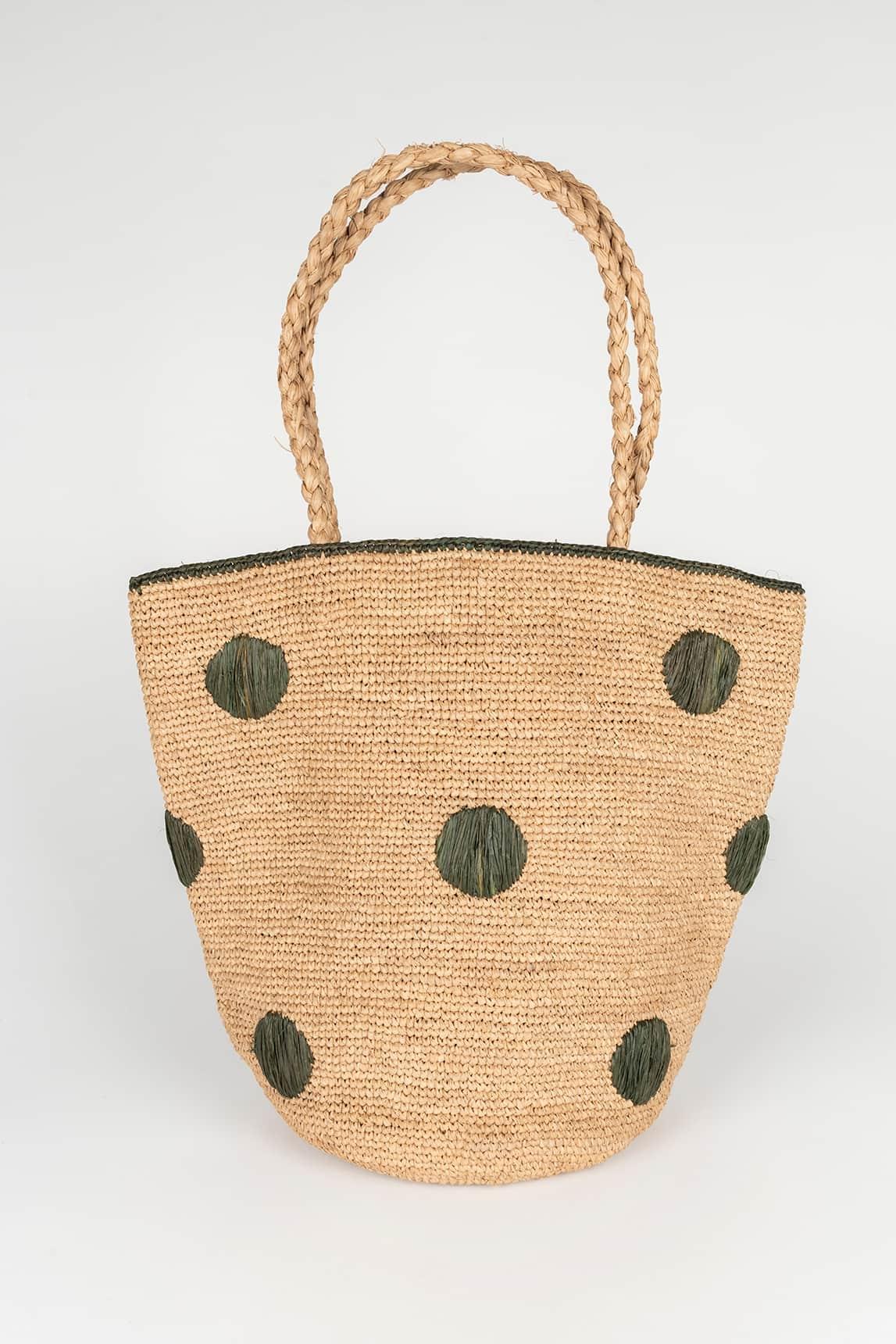 Confeccionado en fibra natural tejida, presenta una silueta ligeramente trapezoidal que equilibra funcionalidad y estética. Los lunares aplicados generan textura visual y rompen la uniformidad del tejido, aportando personalidad sin perder versatilidad. Sus asas redondeadas permiten llevarlo cómodamente al hombro, manteniendo una caída estable y natural.