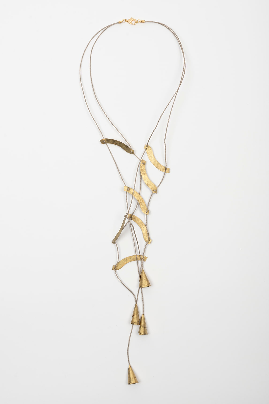 Collar largo de líneas finas en tono dorado, con una caída ligera que se abre en varios hilos y culmina en un conjunto de piezas curvas texturizadas. Los colgantes se disponen en cascada, alternando formas alargadas con pequeños remates tipo campana que añaden balanceo sutil. El cierre superior incluye cadena extensora para ajustar la altura y adaptar el efecto al escote.