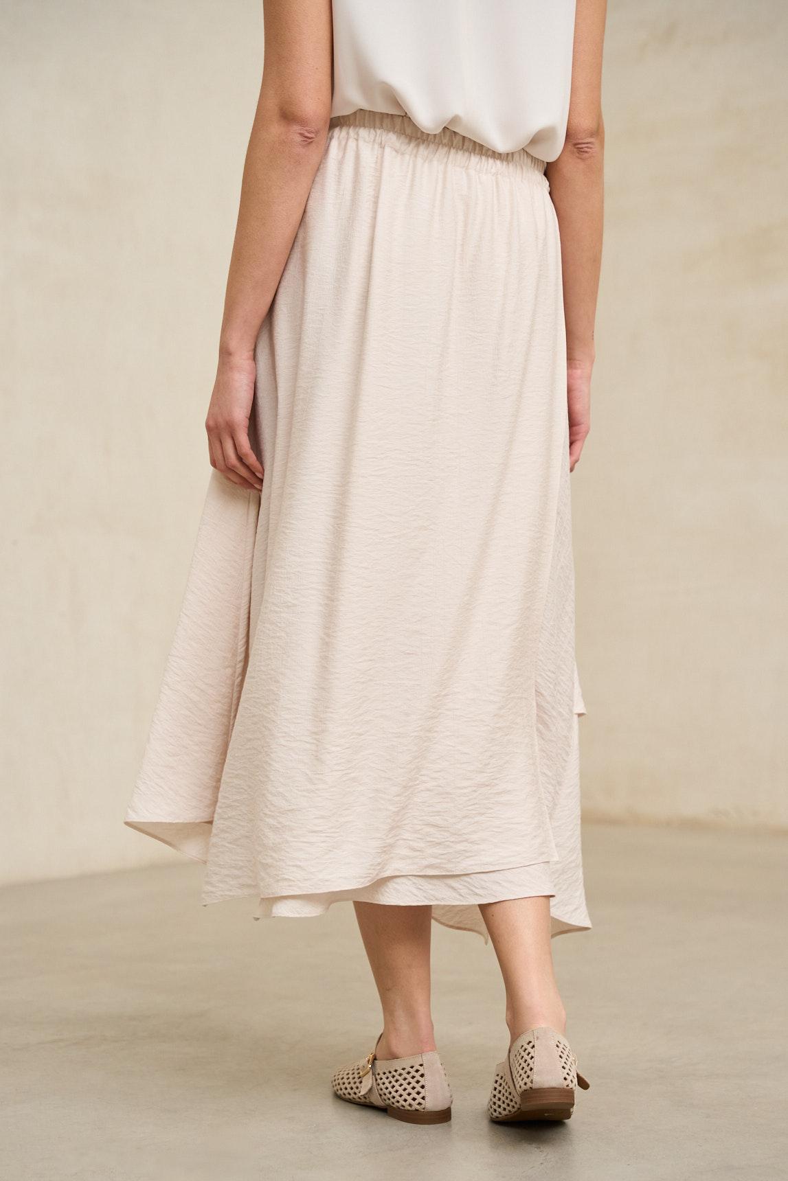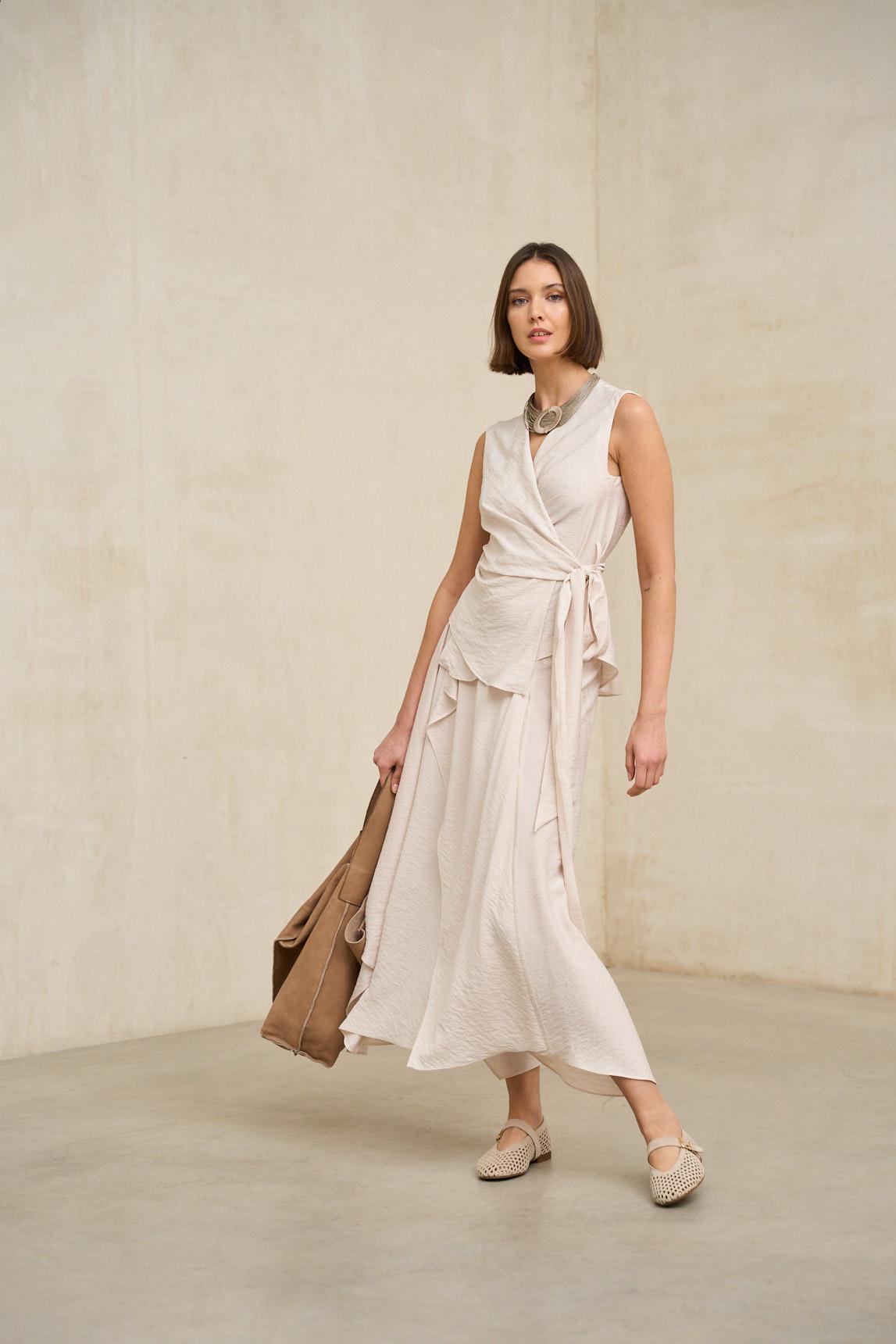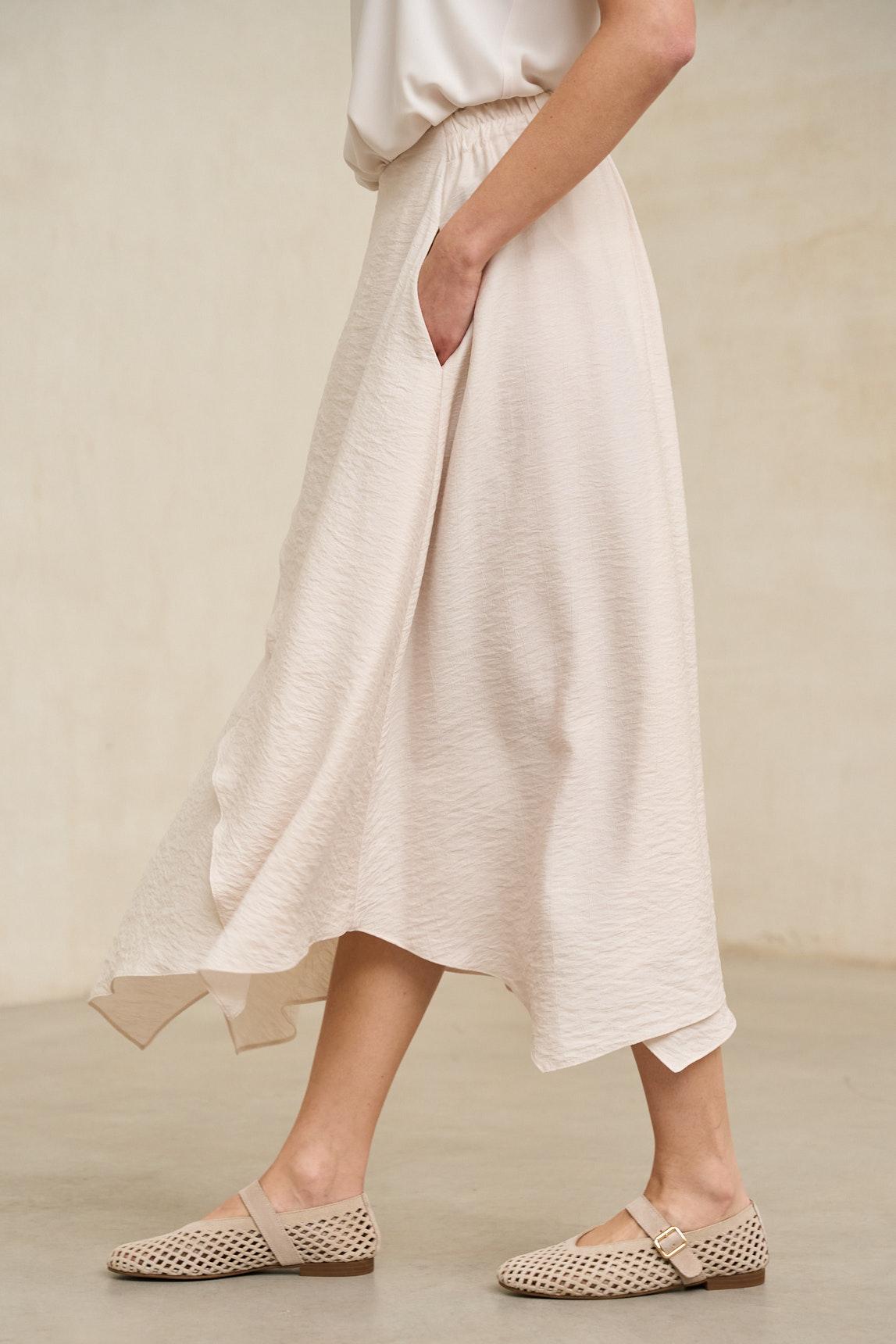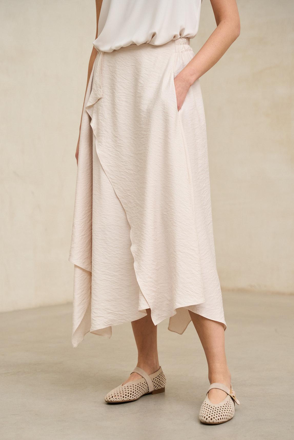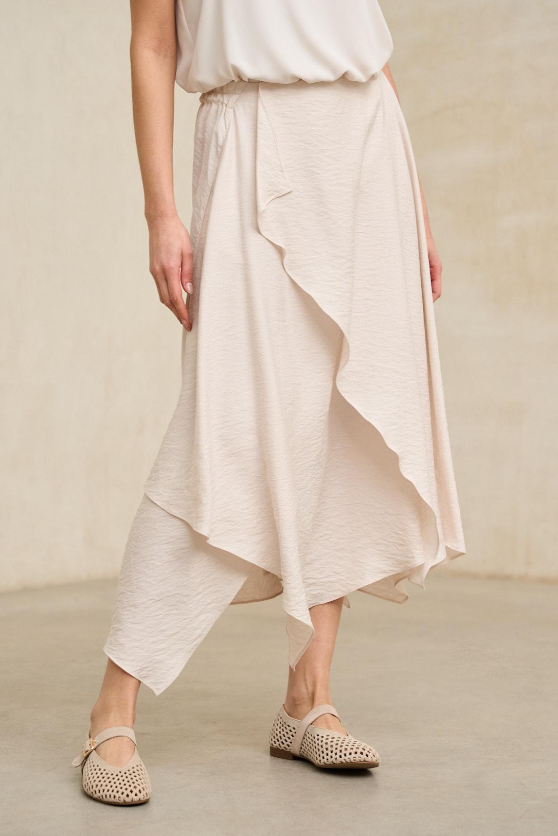 Falda midi confeccionada en tejido ligero con caída fluida y movimiento natural. Presenta diseño envolvente con superposición frontal y bajo asimétrico en diagonal que aporta dinamismo y estiliza visualmente la silueta. La estructura es limpia en la cintura, permitiendo un ajuste cómodo y favorecedor. La Falda Yalira crudo destaca por su estética minimalista y elegante. Su tono neutro luminoso la convierte en una pieza versátil, ideal para combinar con blusas fluidas, tops estructurados o chaquetas ligeras en tonos arena, beige o azul suave. El juego de capas en el delantero aporta profundidad sin sobrecargar el conjunto. Perfecta para primavera y verano, funciona tanto en estilismos relajados de día como en propuestas más sofisticadas para comidas especiales o eventos informales. Una falda atemporal que equilibra sencillez, movimiento y elegancia natural. Nos esforzamos por mostrar los colores de la forma más fiel posible, pero pueden variar ligeramente respecto a la realidad.
