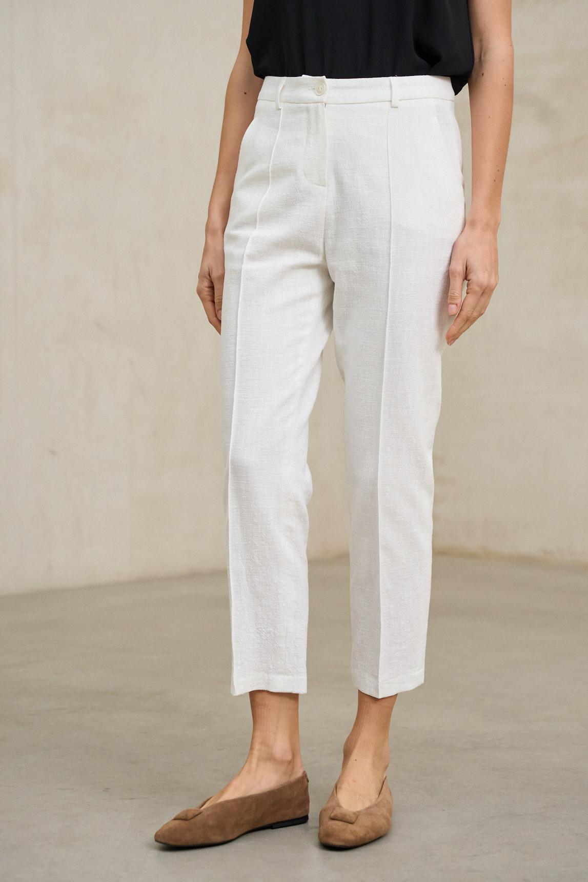 Este pantalón presenta una silueta recta estilizada con pinzas frontales bien definidas que aportan estructura y una lectura limpia del diseño. La cintura es de tiro medio, con cierre frontal discreto y presillas visibles, mientras que las perneras caen de forma fluida y controlada hasta el tobillo, afinando visualmente la pierna. El tejido muestra una superficie lisa y uniforme, con un acabado mate que refuerza su carácter depurado y facilita combinaciones amplias dentro del armario. A nivel de estilo, se trata de un pantalón de corte actual con inspiración sartorial relajada. Su fit equilibra comodidad y presencia, funcionando igual de bien con camisas estructuradas, blusas ligeras o prendas de punto fino. El color blanco aporta luminosidad y sofisticación, ideal para coordinar con tonos naturales, blancos suaves, arena o contrastes más oscuros para un look definido. Disponible también en caqui. Pensado para acompañar tanto rutinas diarias como contextos más cuidados, este pantalón se adapta con facilidad a jornadas de trabajo, comidas informales o estilismos de viaje. Se lleva con naturalidad, transmite orden sin rigidez y se convierte en una pieza clave para construir looks serenos, funcionales y atemporales. Nos esforzamos por mostrar los colores de la forma más fiel posible, pero pueden variar ligeramente respecto a la realidad.
