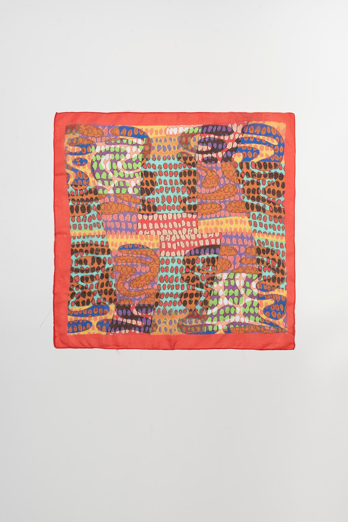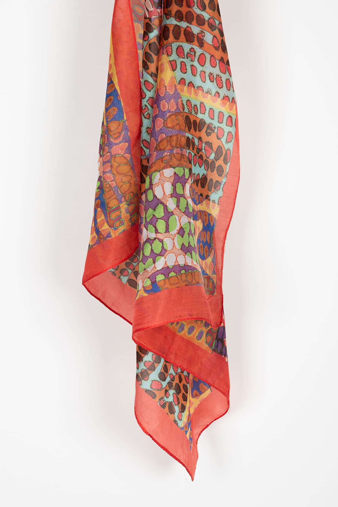 Pañuelo ligero y vaporoso, con caída fluida y tacto suave. Presenta un estampado orgánico de inspiración animal con motivos en forma de puntos y degradados en tonos vivos, enmarcado por un borde ancho coral que define el contorno y aporta contraste. Acabado fino, ideal para anudar sin volumen.