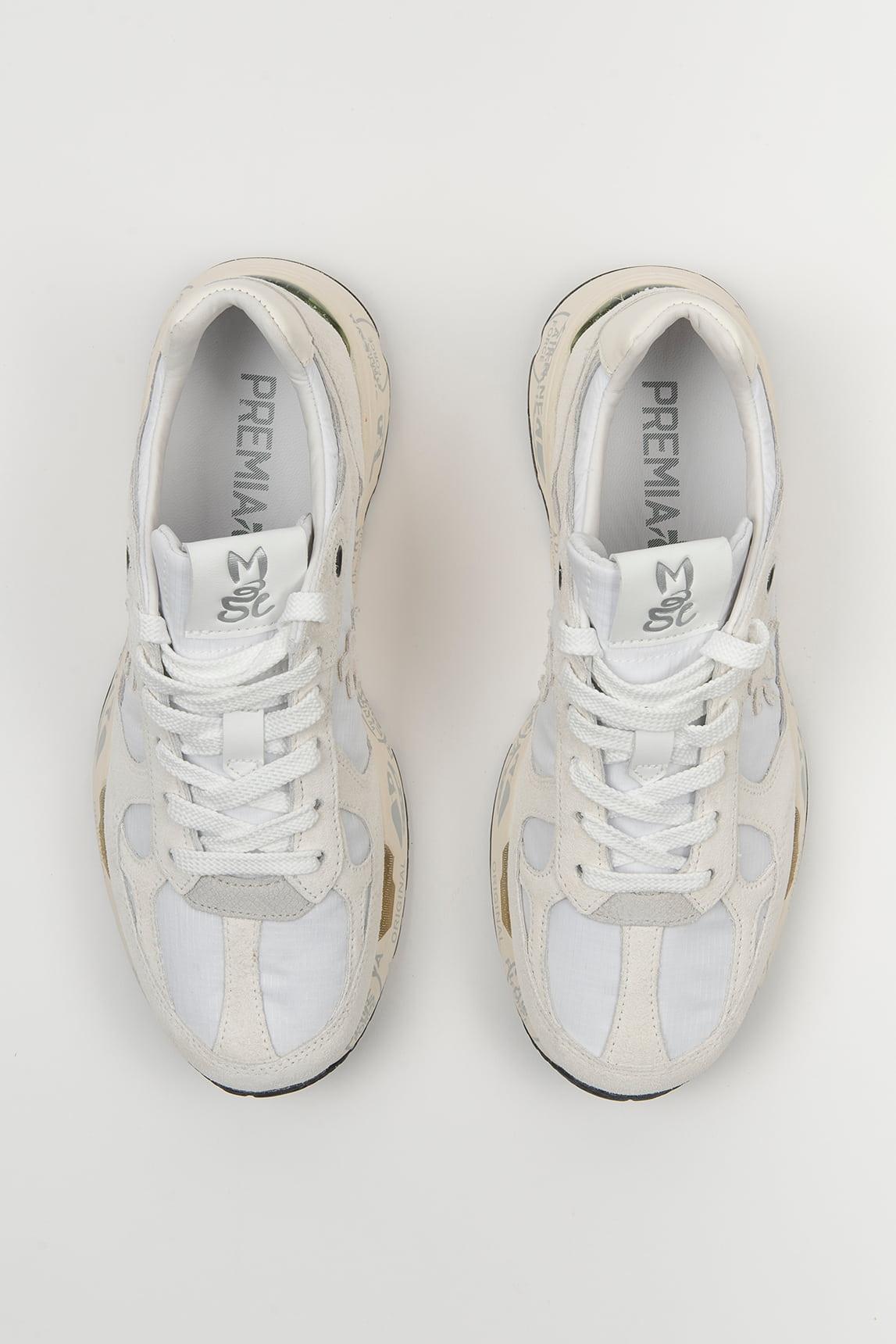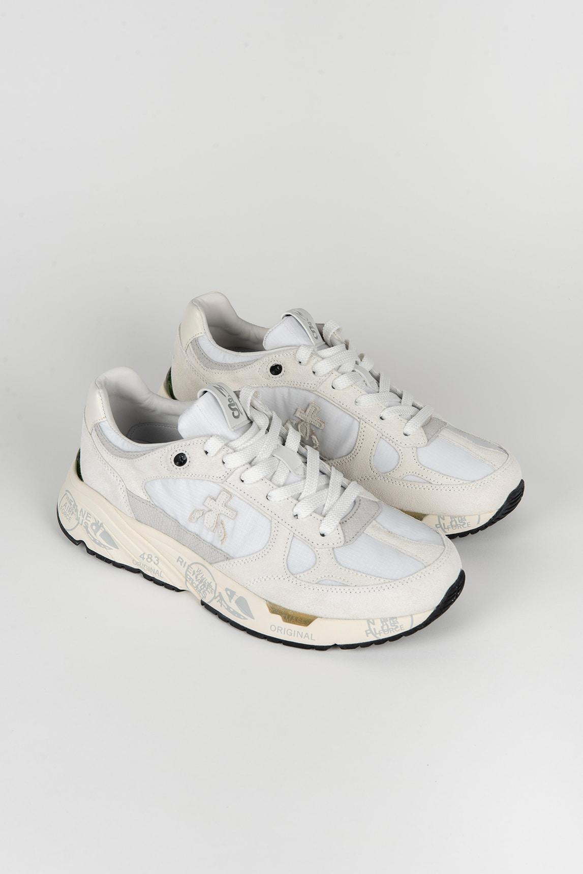 El modelo mezcla serraje suave y tejido técnico, ofreciendo ligereza, transpirabilidad y comodidad durante todo el día. La suela con gráficos característicos de Premiata añade identidad al diseño, mientras que su construcción proporciona estabilidad y amortiguación en cada paso.