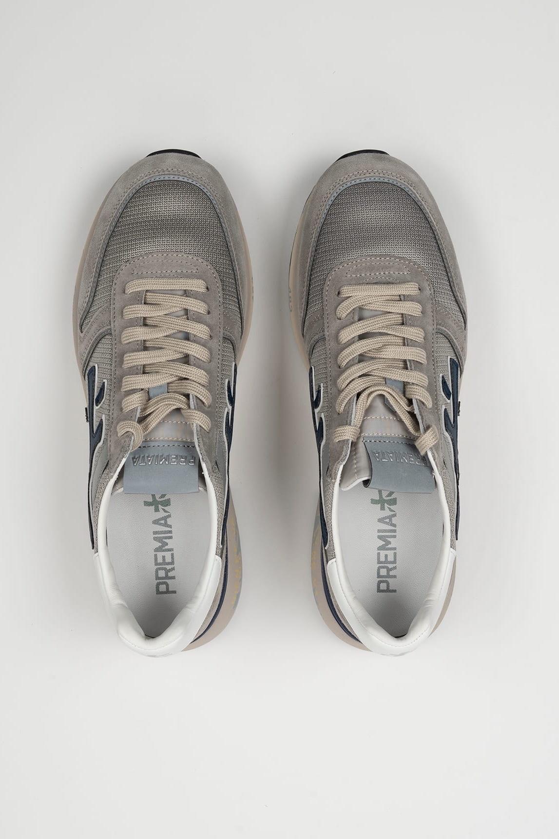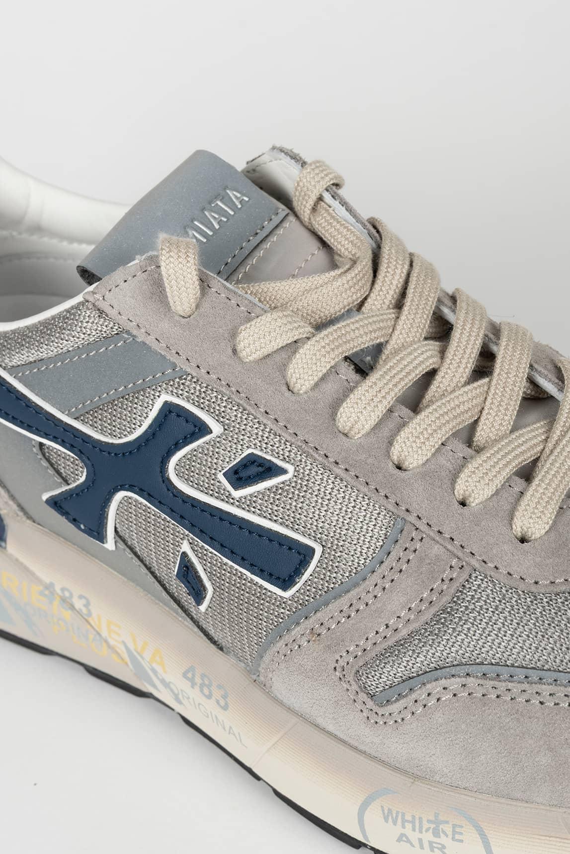 El modelo Premiata Mick 8001 combina tonos gris claro con detalles azulados que aportan frescura y modernidad. Su silueta runner se actualiza mediante una cuidada mezcla de materiales técnicos y ante suave.