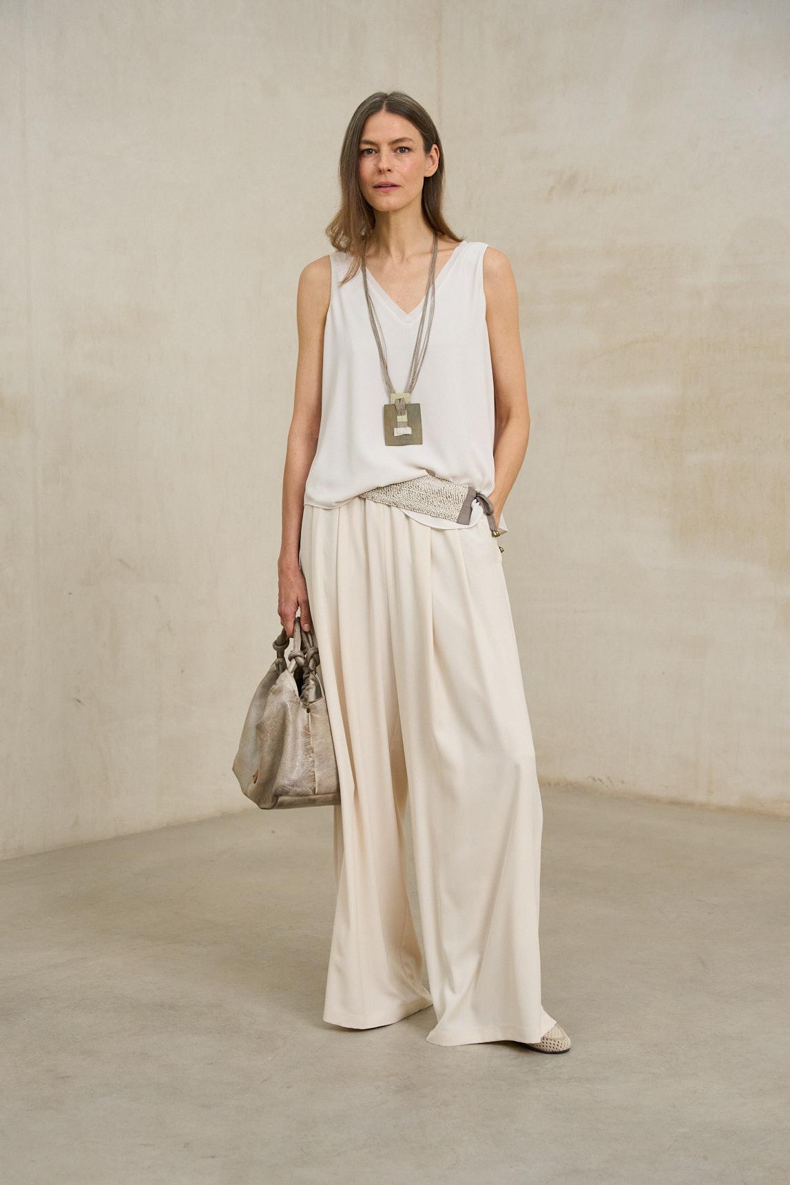 Este top sin mangas presenta una silueta ligera y amplia, definida por un escote en pico delantero y trasero que estiliza la parte superior. El tejido muestra una caída suave y continua, con un acabado liso que potencia la sensación de fluidez. El bajo ligeramente redondeado aporta movimiento y refuerza su estética relajada, mientras que el corte suelto permite que la prenda acompañe el cuerpo sin ajustarse.