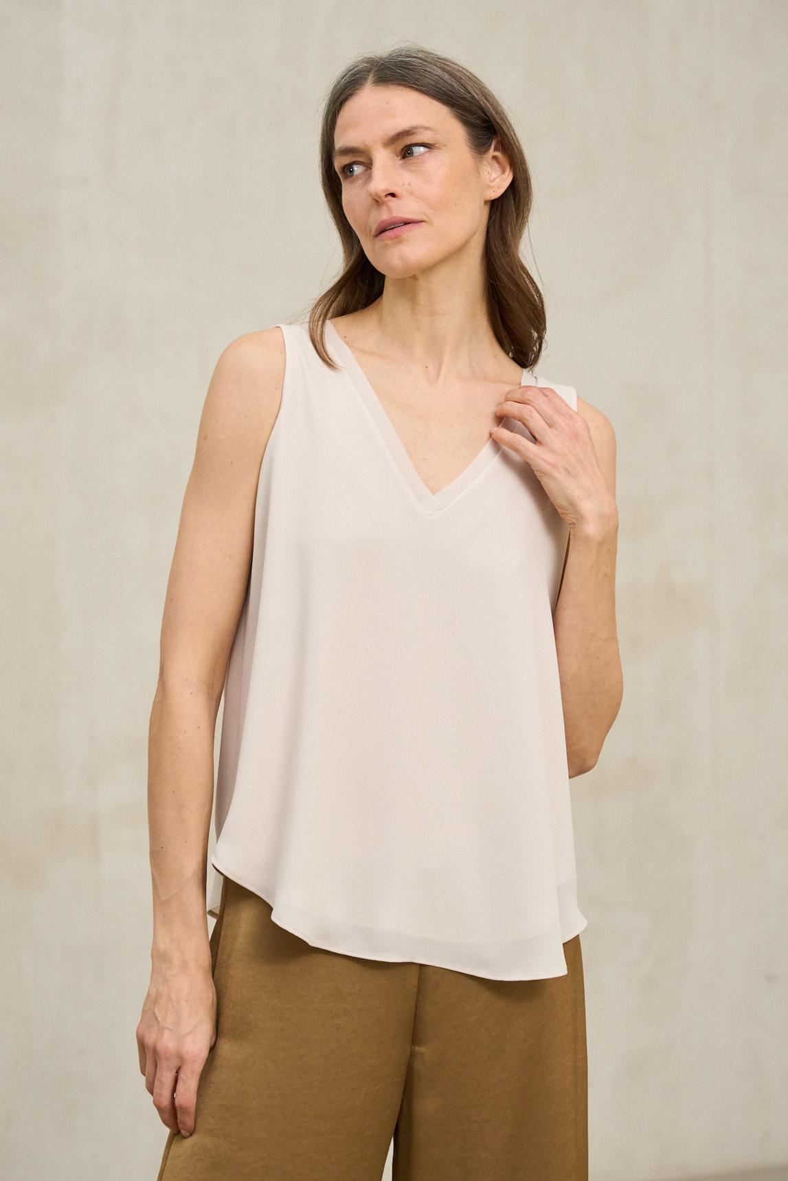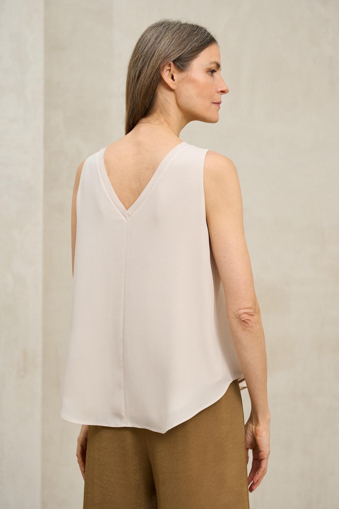 Este top sin mangas presenta una silueta fluida con escote en pico tanto en la parte delantera como en la espalda, creando una línea estilizada y ligera. El tejido muestra una caída suave y continua, con un acabado liso y delicado que aporta movimiento natural a la prenda. El bajo ligeramente redondeado suaviza la estructura y refuerza su carácter relajado, mientras que el corte amplio permite que el top se deslice con ligereza sobre el cuerpo sin ceñirse.