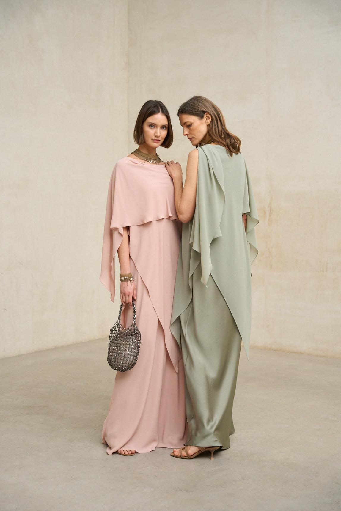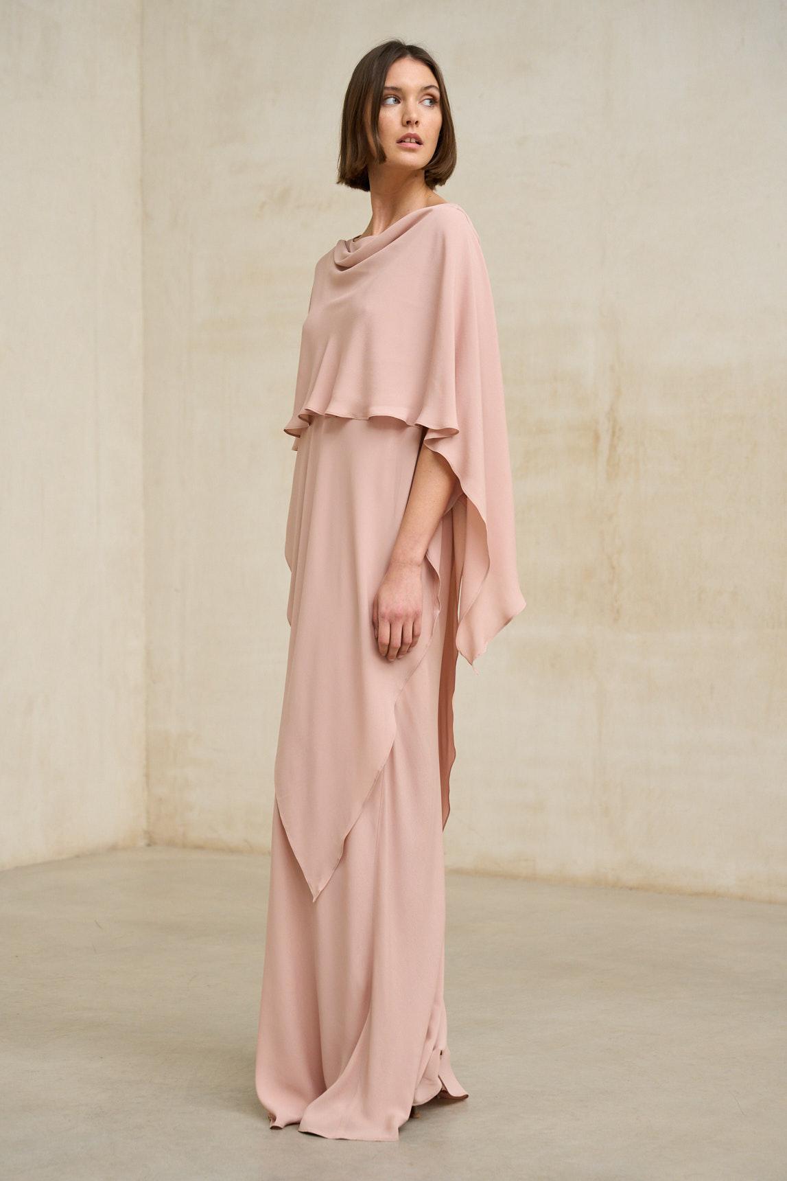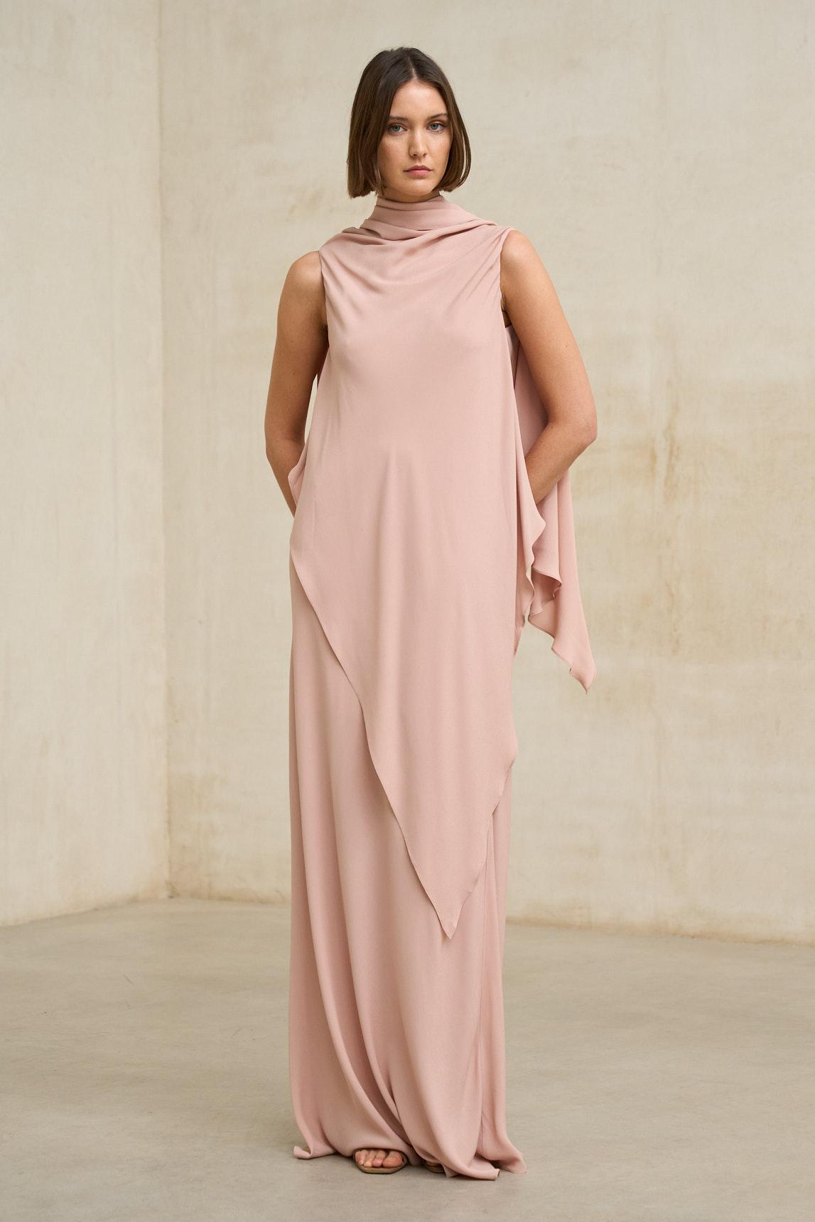 El vestido Kaedryn rosa empolvado es una pieza de invitada sofisticada y contemporánea diseñada para eventos especiales. Su silueta fluida y alargada estiliza la figura con una caída limpia y elegante, mientras que su tono rosa suave aporta luminosidad y delicadeza. El diseño incorpora una capa integrada que puede colocarse de distintas maneras: suelta sobre los hombros, cruzada tipo fular o envolviendo ligeramente los brazos.