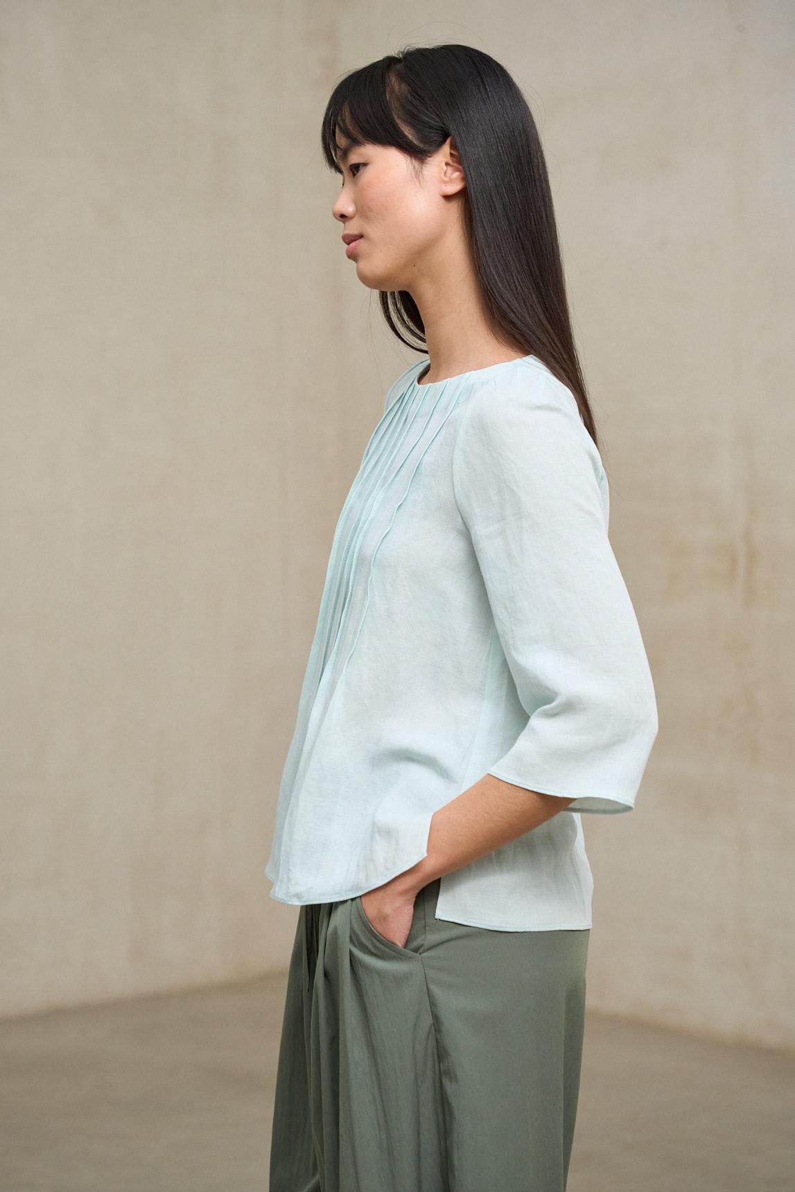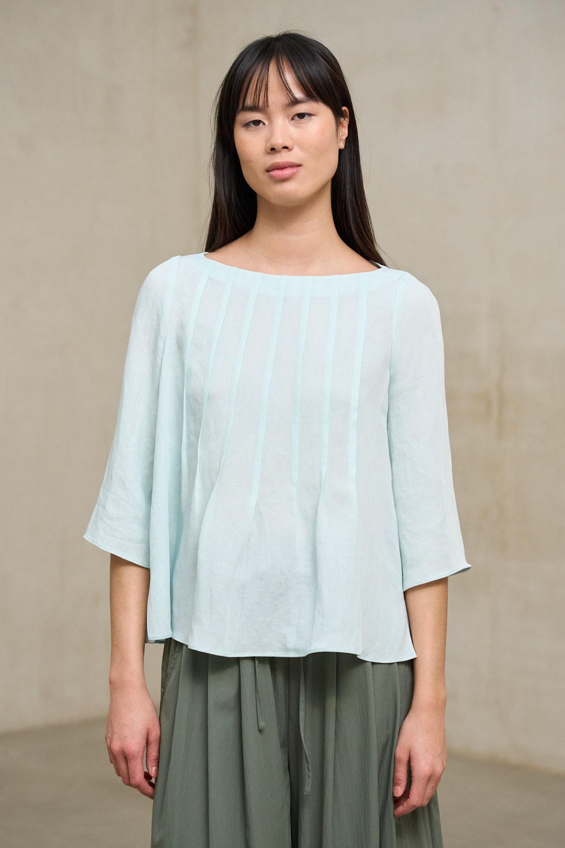 El tejido, de aspecto ligeramente texturizado, refuerza su carácter liviano y la convierte en una opción ideal para primavera y verano. El tono azul claro aporta luminosidad y un matiz fresco que combina especialmente bien con blancos rotos, crudos, arena o verde oliva. Es una pieza versátil que funciona tanto con pantalones amplios como con faldas fluidas para un look equilibrado y contemporáneo.