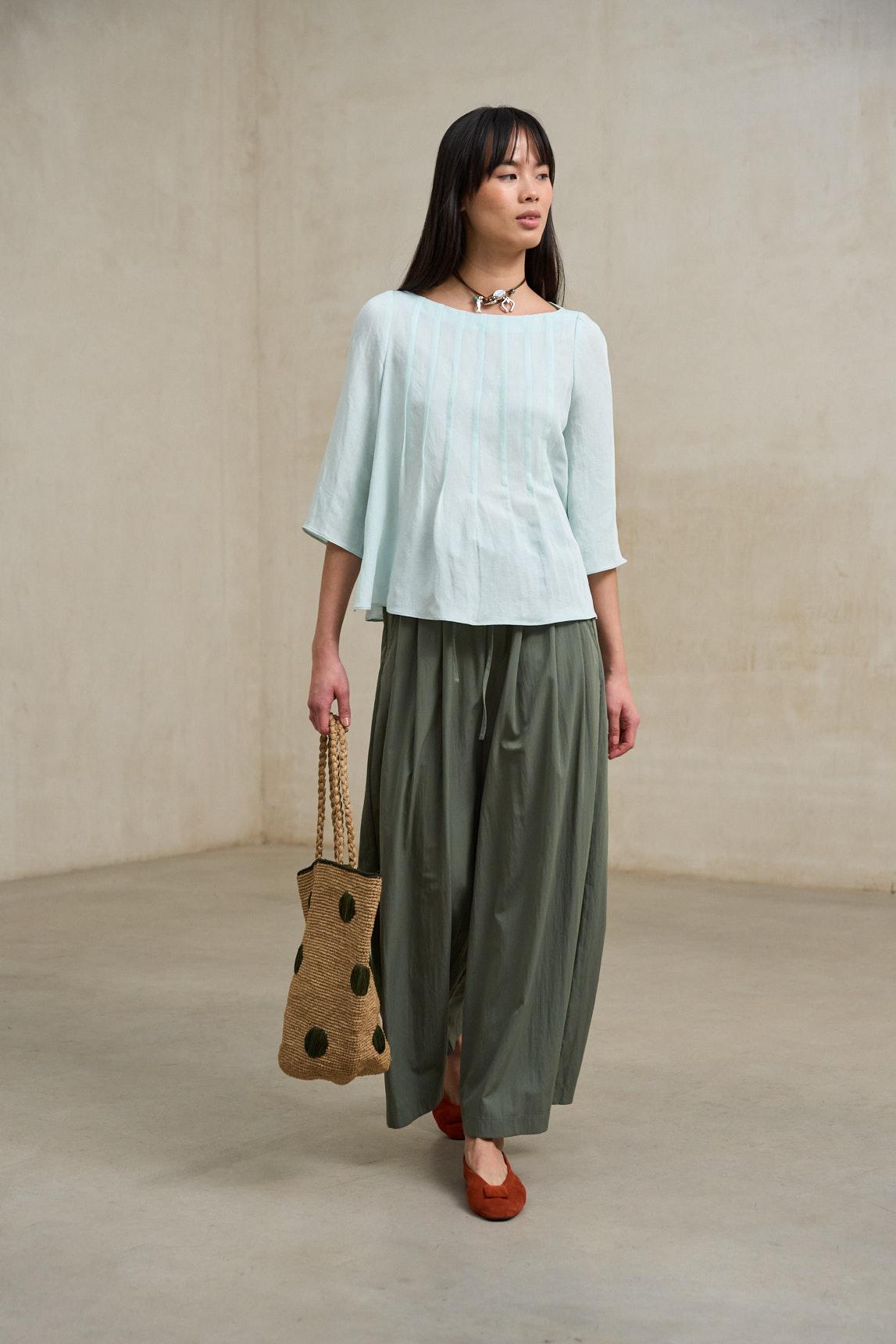 La blusa Évania azul claro está confeccionada en tejido ligero de caída suave que aporta movimiento y frescura al conjunto. Presenta escote redondeado amplio y manga amplia tipo capa hasta el codo, creando una silueta fluida y relajada que estiliza sin ceñir. Su corte recto y estructura vaporosa permiten que la prenda acompañe el movimiento con naturalidad.