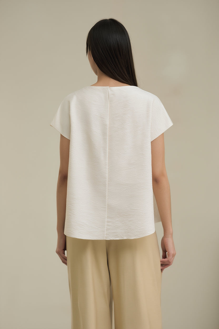 Women's ecru blouse with a round neckline, dropped short sleeves, and a flowing silhouette. The design stands out for its side draping with a knot effect, which gently gathers the fabric and creates an asymmetrical hem, providing movement and a very flattering, flowing line. The surface has a smooth finish with a slight visual texture, reinforcing a clean, elegant, and modern image.