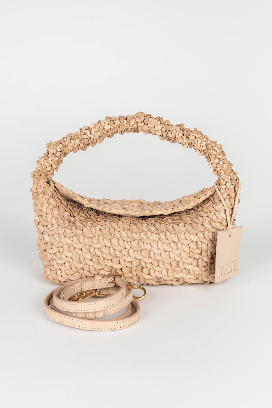 Bolso de piel trenzada en tono beige claro, elegante y luminoso, ideal para estilismos suaves y combinaciones naturales.