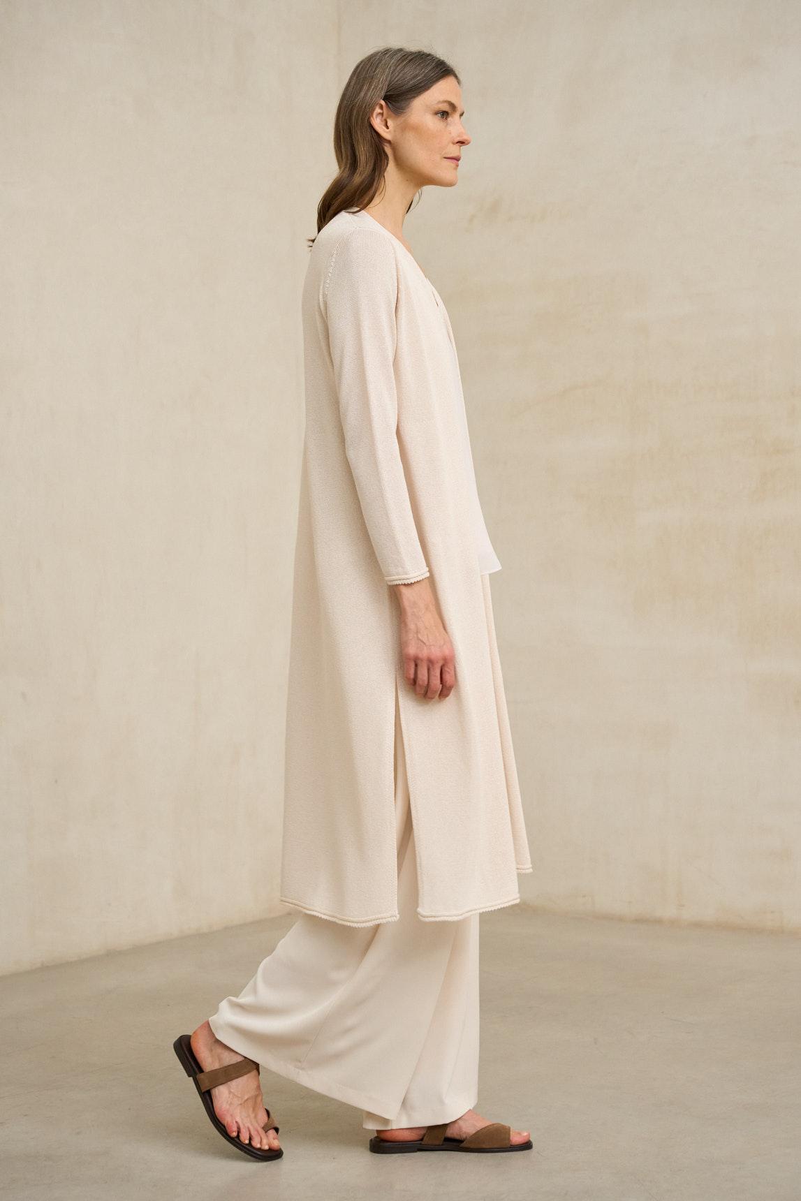 Confeccionada en tejido de punto suave y ligero, presenta manga larga y un bajo ligeramente evasé que aporta movimiento al caminar. El tono crudo, luminoso y atemporal, refuerza su versatilidad dentro de una paleta neutra, combinando fácilmente con arena, camel, verde oliva o gris antracita.