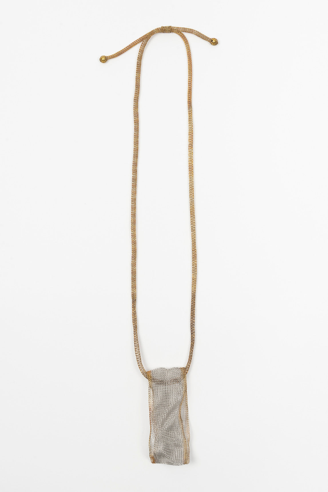 Long necklace made of soft, malleable metal mesh, with a fluid drape that adds movement and character to any look. The combination of gold and silver tones creates a subtle, luminous contrast that makes it a highly versatile piece.