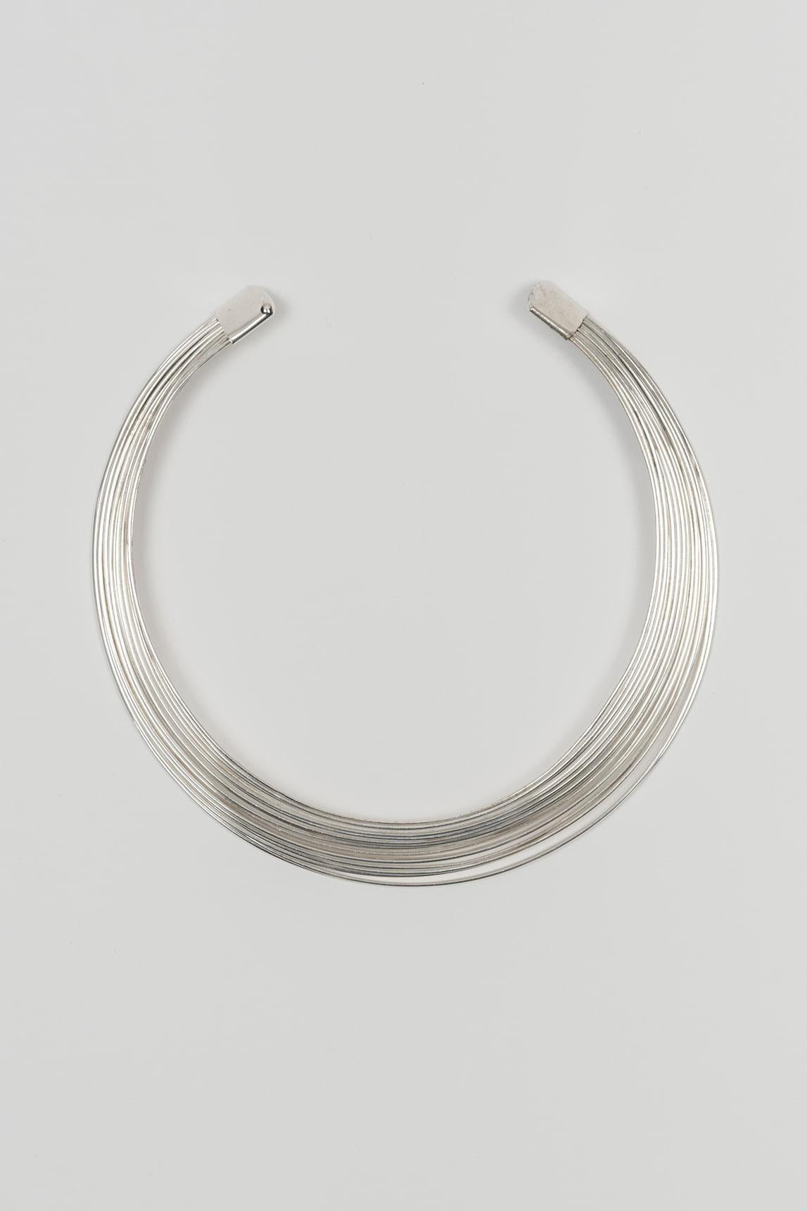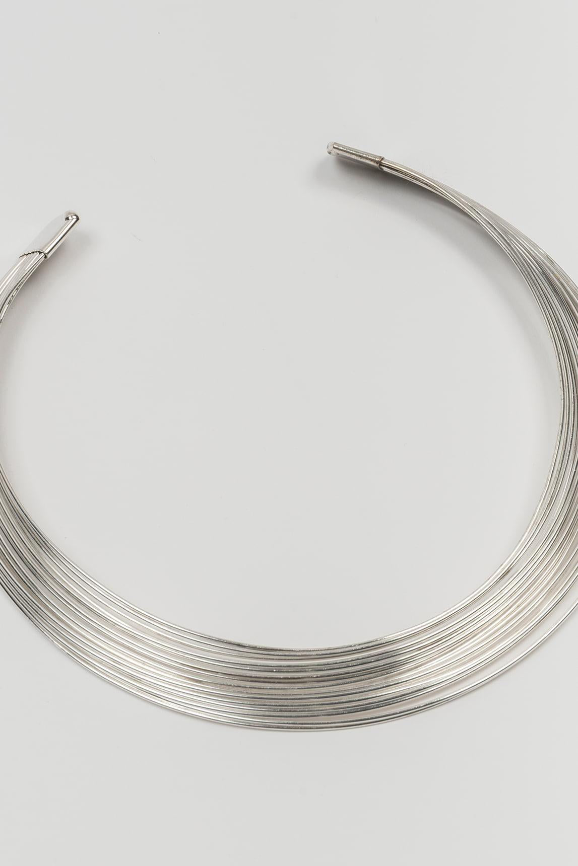 Women's silver necklace with a multi-chain design and a rigid open choker structure. The piece brings together several overlapping thin lines that wrap around the neck with a light, clean, and very sophisticated effect, creating an open silhouette of great visual elegance. The silver finish provides a colder, more contemporary shine that reinforces its refined character.