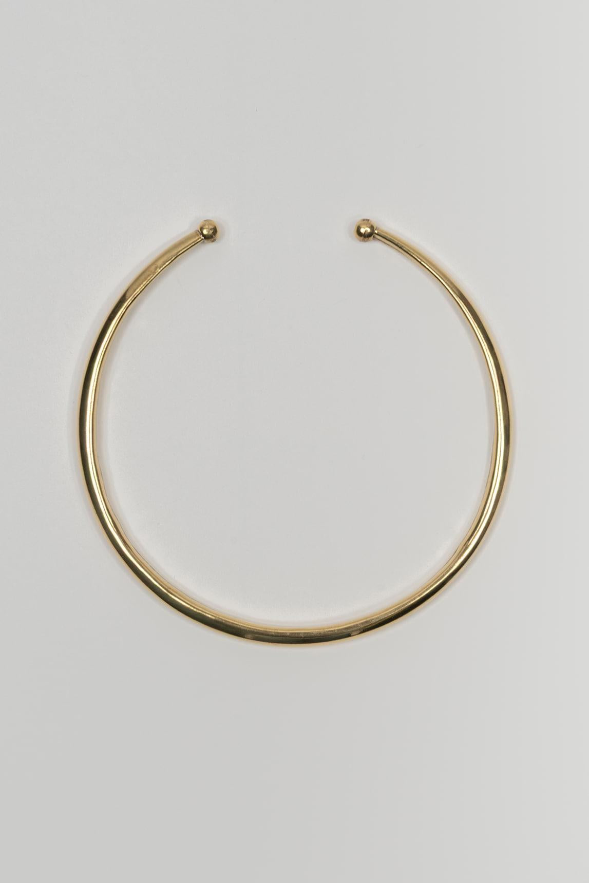 Women's brass necklace featuring a rigid open choker design and a clean, round silhouette. The piece showcases a smooth and refined structure, with a warm metallic finish that adds light and an elegant presence without being overdone. Its minimalist shape naturally frames the neck, making the metal the true star of the design.