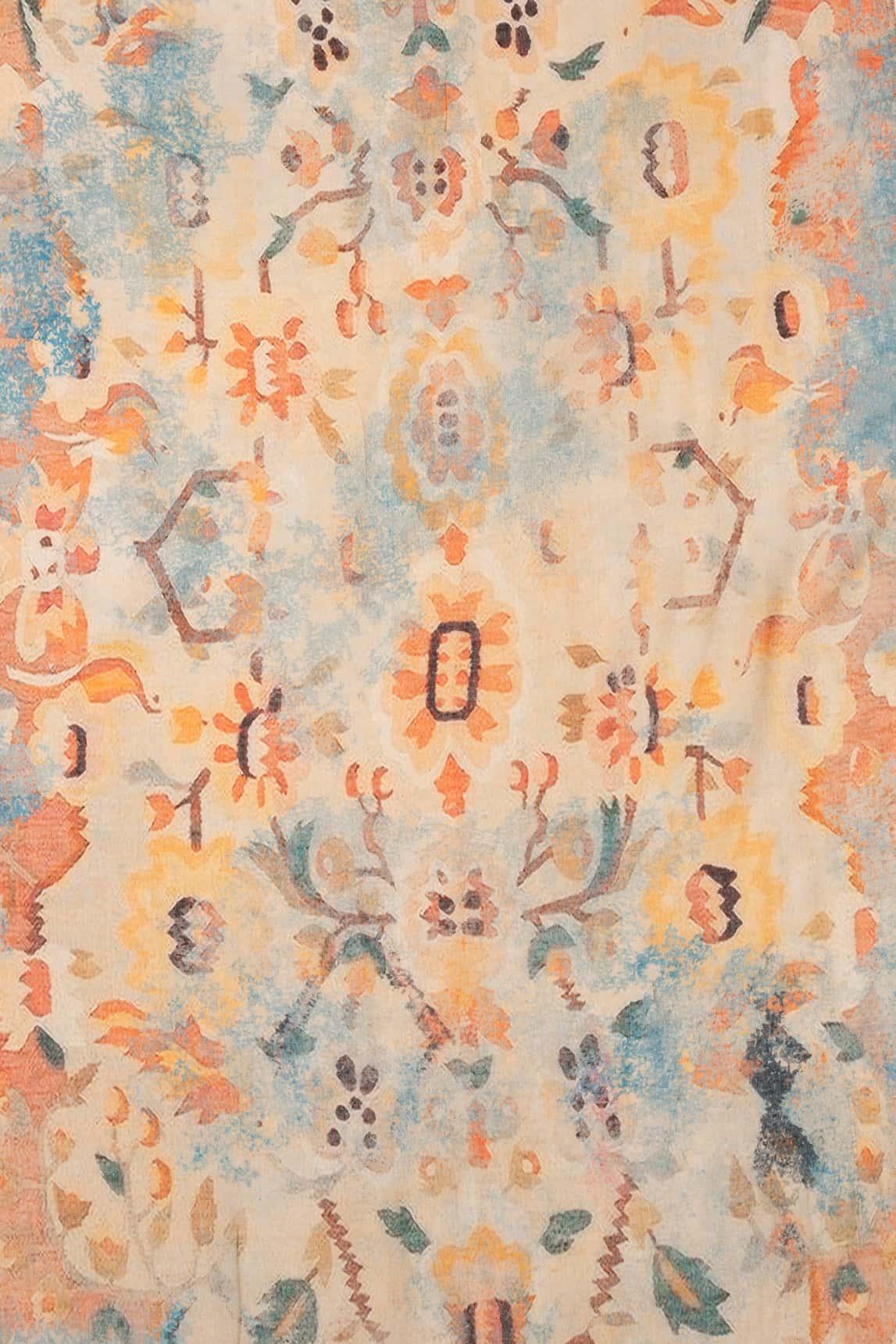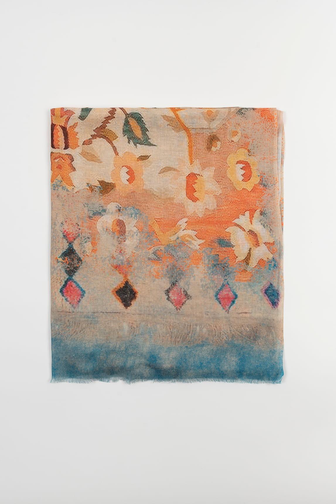 Women's scarf made from a natural blend of 60% cotton, 20% modal, and 20% linen. Its lightweight and breathable fabric features an artistic print in shades of blue, coral, and sand with a watercolor effect, giving it a fresh, summery feel. The delicately finished edges enhance its fluid and natural drape. The Maren Watercolor Scarf combines softness, texture, and color in a unique piece. Perfect for pairing with Mediterranean-inspired outfits or urban spring looks, it adds a handcrafted and luminous touch to any style. We strive to display colors as accurately as possible, but they may vary slightly from reality.
