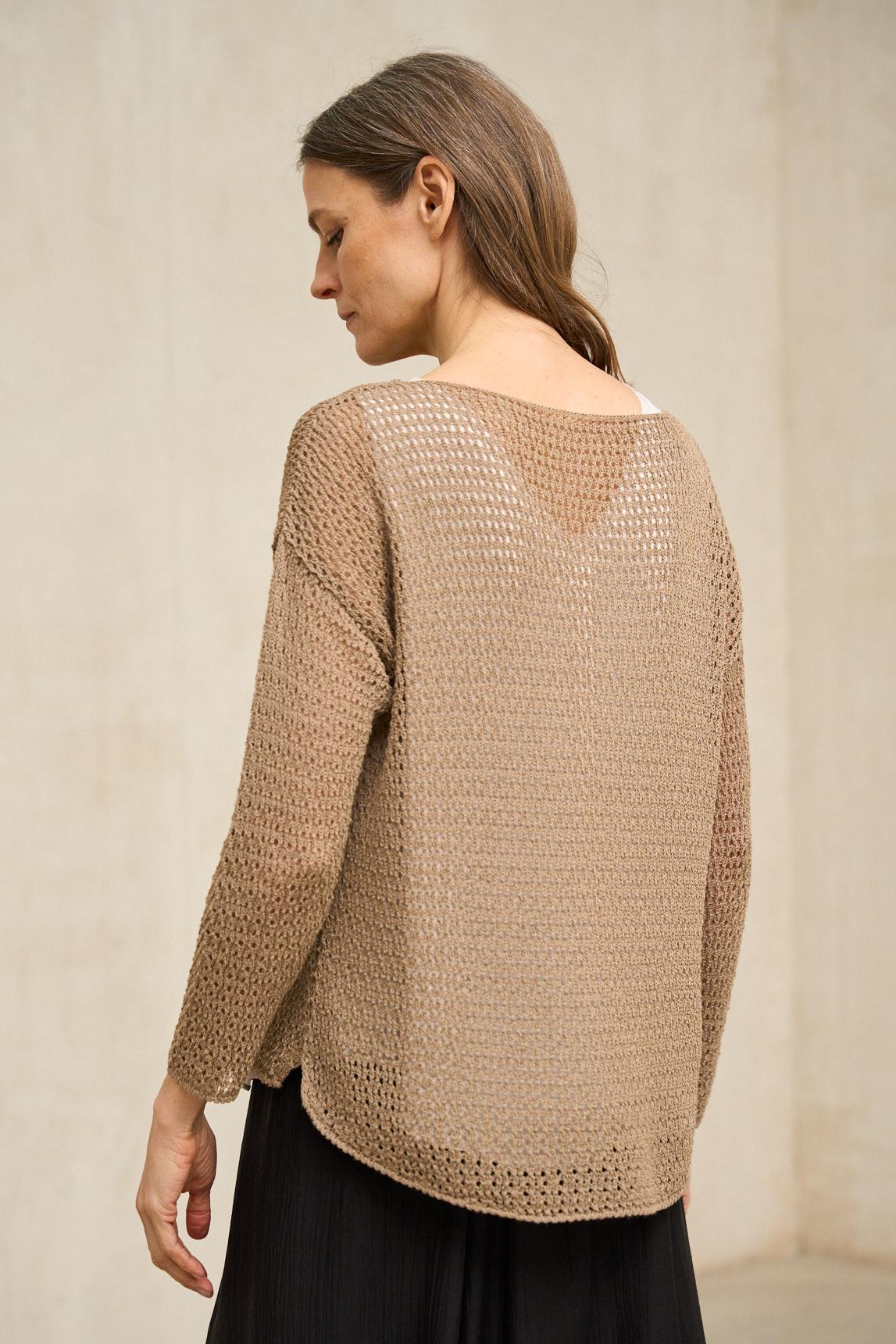 El jersey Lúvena camel suave es una prenda ligera confeccionada en punto fino con textura calada en la parte superior, que aporta un sutil juego visual y un acabado delicado. Su tejido es ligeramente translúcido, por lo que se recomienda combinarlo con una camiseta interior o top básico (no incluido). Para un acabado limpio y armónico, recomendamos el top Alenia blanco roto, diseñado como base perfecta para este tipo de prendas caladas. Presenta escote redondo amplio y manga tres cuartos, con una caída suave que favorece la silueta sin ceñir. Su estructura liviana lo convierte en una opción ideal para entretiempo o para superponer sobre prendas ligeras. El tono camel suave aporta calidez y profundidad, integrándose con facilidad en looks en gama tierra, crudos o contrastes en blanco. Una pieza versátil que equilibra sencillez y textura con un aire natural y sofisticado. Nos esforzamos por mostrar los colores de la forma más fiel posible, pero pueden variar ligeramente respecto a la realidad.