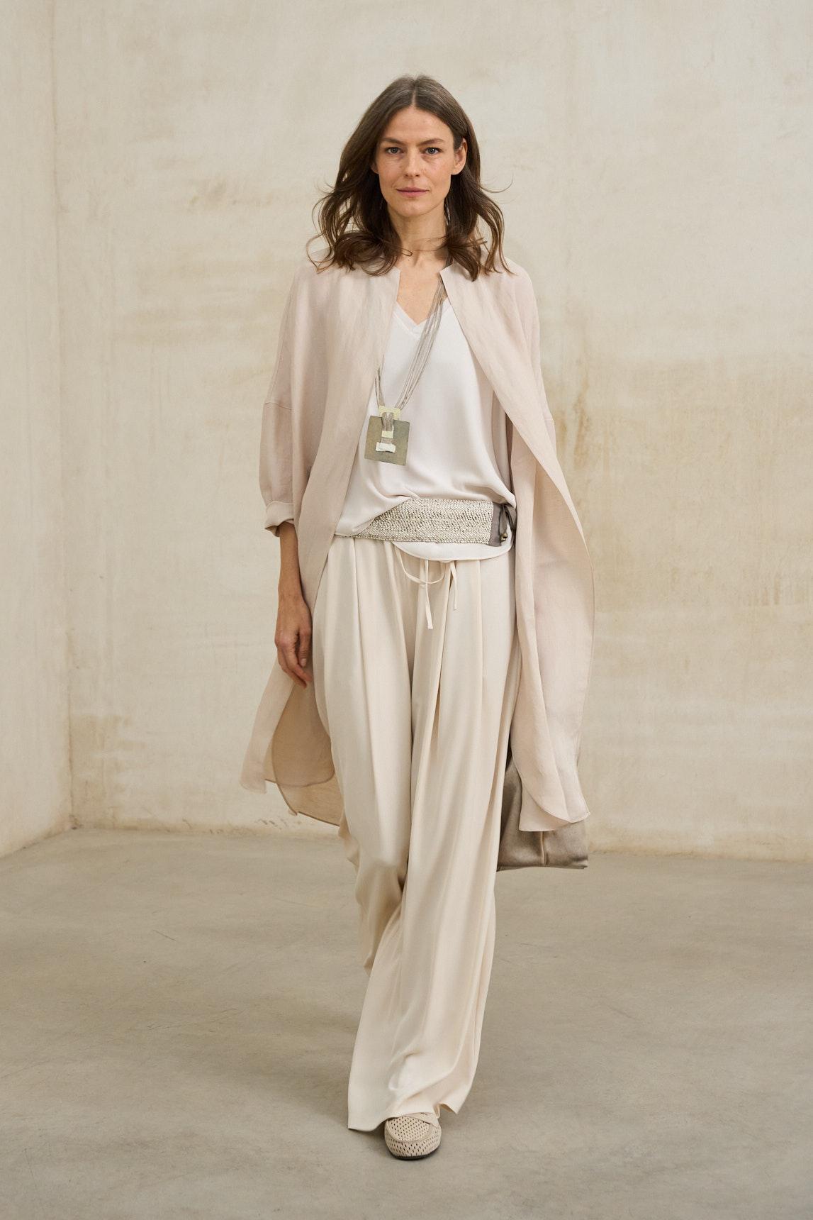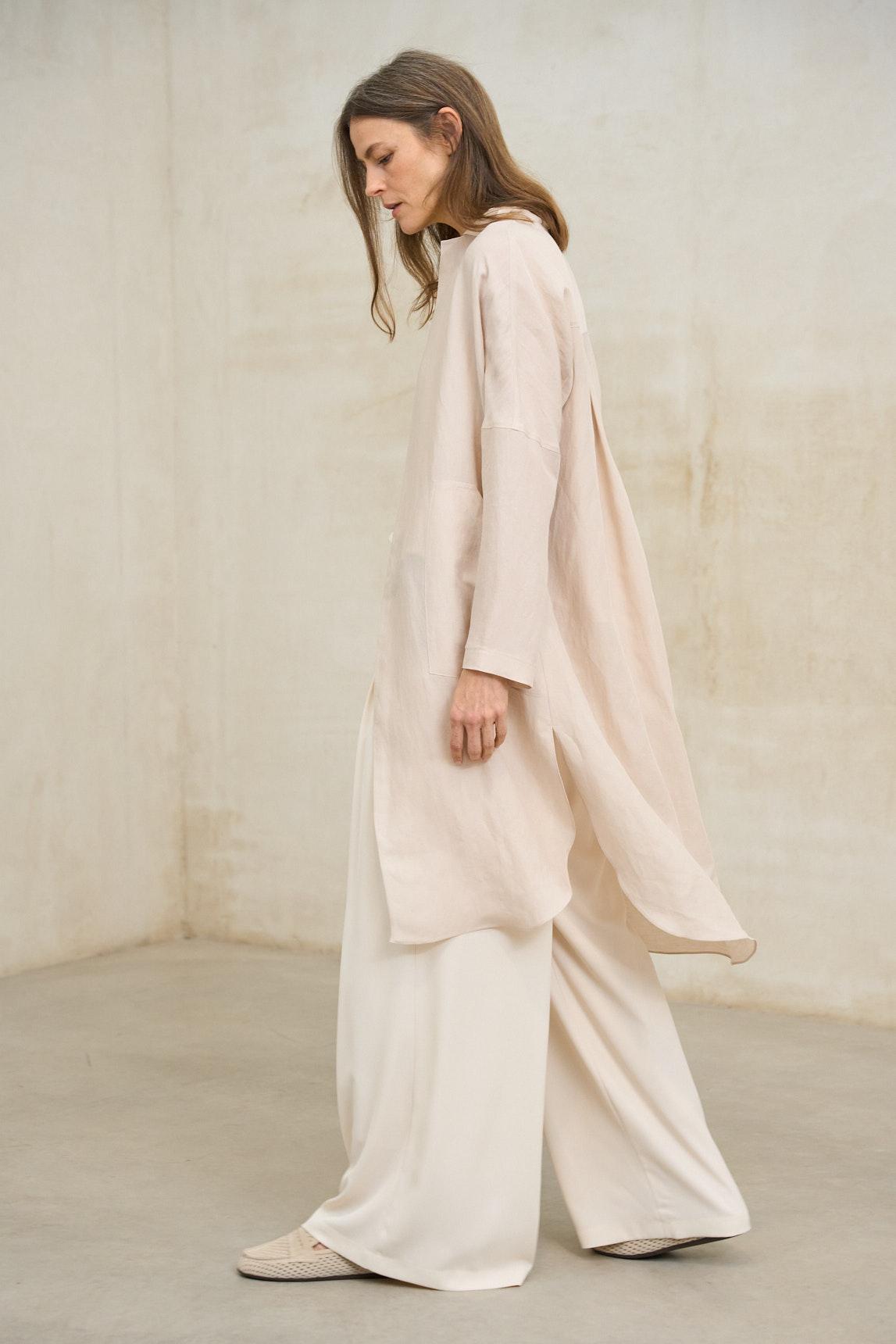The Lirael dusty ecru frock coat is a lightweight garment with clean lines and a flowing drape, designed to complete elegant looks with a sophisticated and minimalist feel. Its open design, without a visible closure, allows the fabric to move naturally with you. With long sleeves and a slightly relaxed, straight cut, it easily adapts to dresses, flowing outfits, or wide-leg trousers, adding a subtle layer without detracting from the main look. The soft, lightweight fabric reinforces its versatility for transitional weather or special occasions. The raw, delicate, and luminous tone blends easily with monochromatic outfits or looks for weddings, communions, and special celebrations. It's a refined garment that balances elegance and comfort. We strive to display colors as accurately as possible, but they may vary slightly from reality.
