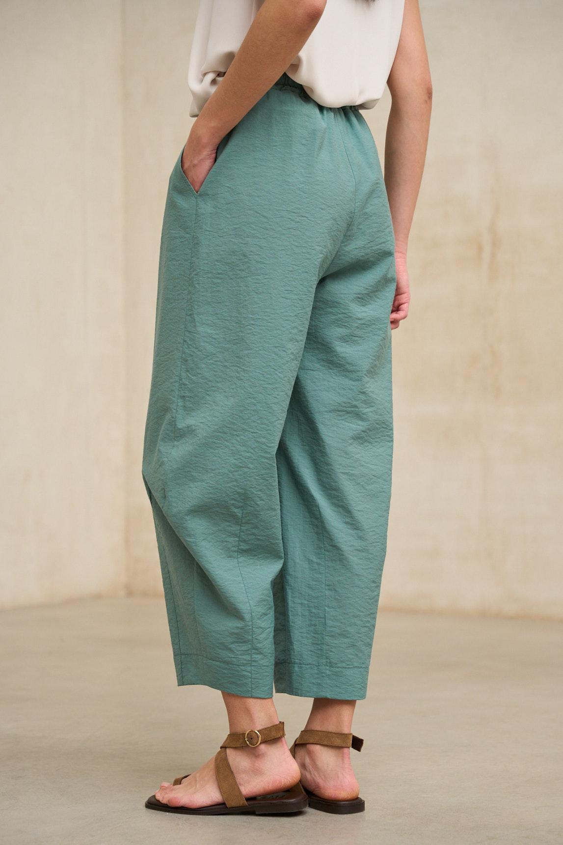 Pantalón de mujer confeccionado en tejido ligero con textura natural y caída suave. Presenta cintura elástica con fruncido delicado y pernera amplia ligeramente ajustada en el bajo, creando una silueta relajada con volumen controlado. Incorpora bolsillos laterales discretos que aportan funcionalidad sin alterar la línea limpia del diseño.