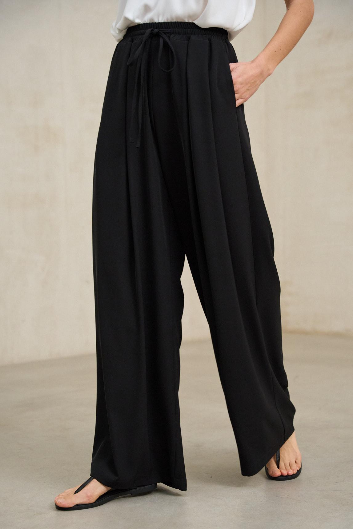 El pantalón Lirien negro mantiene su silueta amplia y fluida, con una caída suave que aporta movimiento y sofisticación al caminar. Confeccionado en tejido ligero, presenta una pierna ancha que estiliza visualmente la figura y crea una línea alargada y elegante. La cintura estructurada equilibra el volumen del conjunto, generando una proporción armónica entre ajuste superior y amplitud inferior.