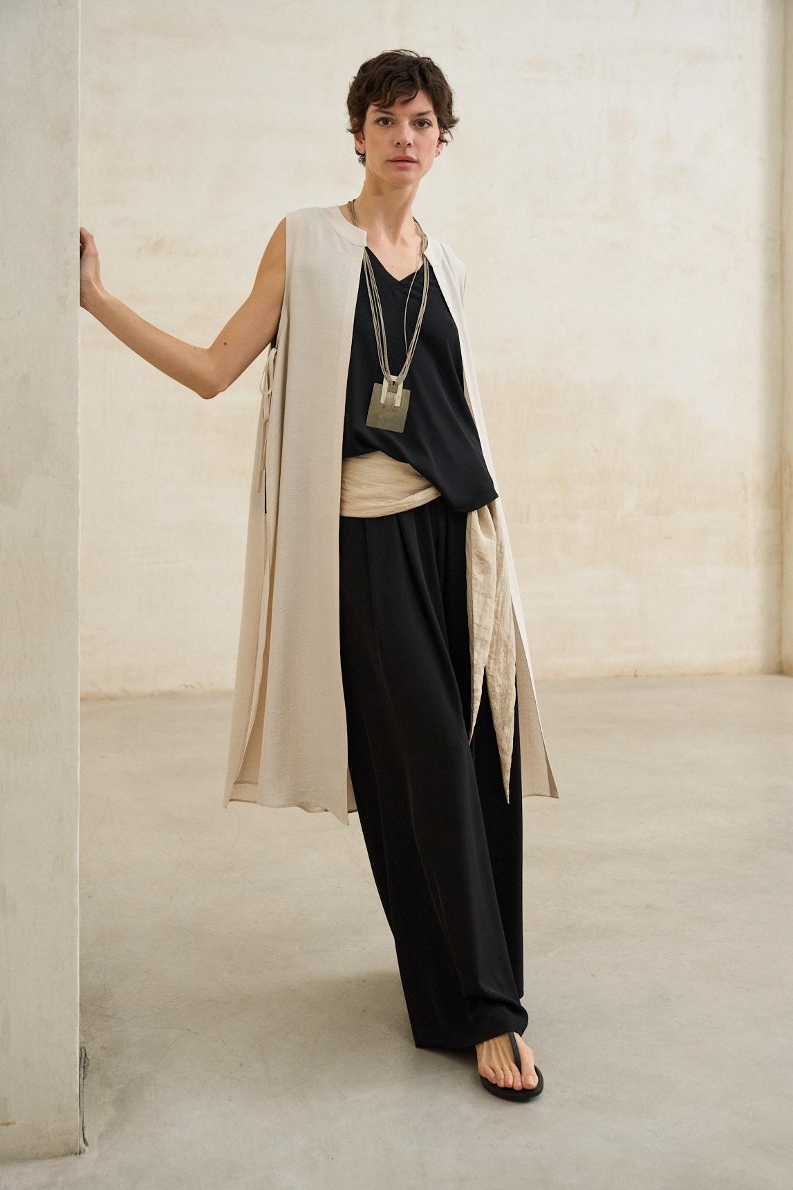 En color negro, el diseño adquiere un carácter más rotundo y versátil, convirtiéndose en una base imprescindible para estilismos tanto minimalistas como más sofisticados. El Lirien negro funciona a la perfección con blusas ligeras, tops estructurados o prendas de punto fino. Puede adaptarse a looks de oficina, eventos informales o estilismos de noche combinándolo con sandalias, mocasines o tacón medio. Su fluidez aporta comodidad sin perder presencia, consolidándose como una pieza atemporal dentro del armario contemporáneo.