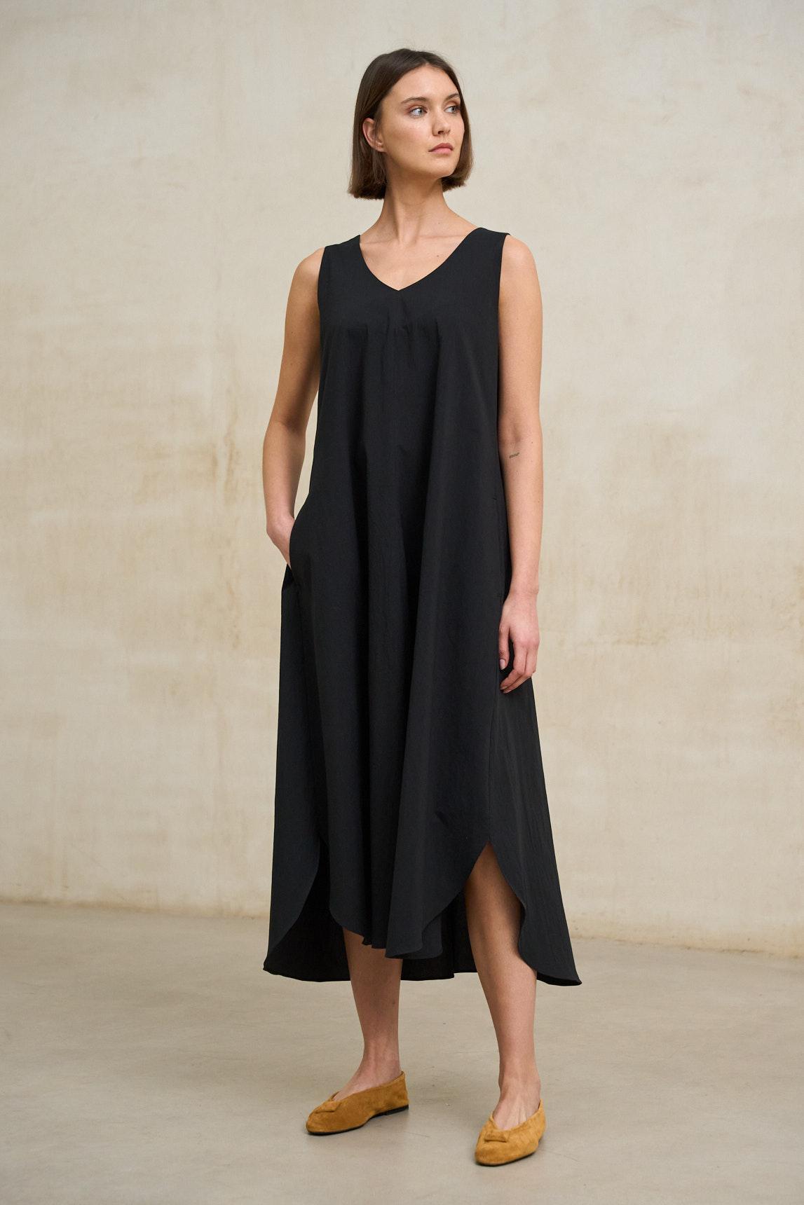 The Serely black dress is a flowing, elegant piece that combines simplicity and movement in a contemporary design. Made from a lightweight, fluid fabric, it features a V-neck and a sleeveless cut that flatters the upper body and visually lengthens the figure. Its A-line silhouette creates a balanced volume that flows smoothly from the torso, adding dynamism to the walk. The hem incorporates a slight asymmetry that adds character and reinforces its fluid effect without sacrificing sophistication. Deep, timeless black makes this garment a sophisticated staple that works equally well in daytime looks with flat sandals or in more polished outfits with structured accessories. It's a versatile option for casual events, dinners, or minimalist yet striking looks. A comfortable, elegant and easy-to-wear dress that balances lightness and character with naturalness. We strive to display colors as accurately as possible, but they may vary slightly from reality.