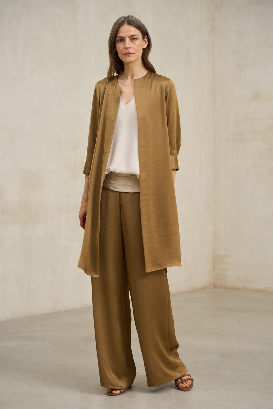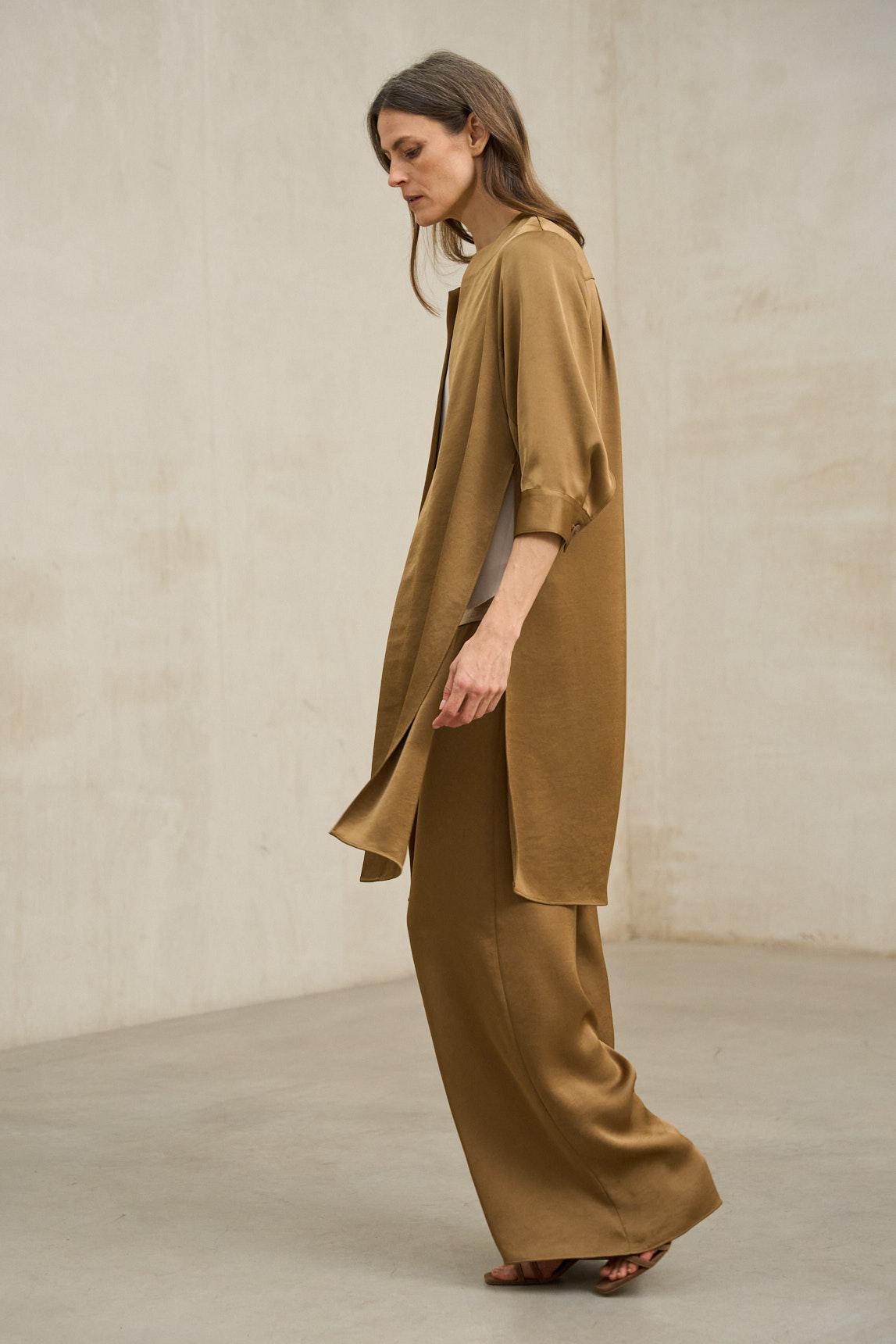 La levita Lirael camel tostado es una prenda ligera de silueta abierta y caída fluida, diseñada para aportar estructura suave sin rigidez. Su diseño sin cierre permite que el tejido se deslice con naturalidad, creando un efecto elegante y relajado al mismo tiempo.