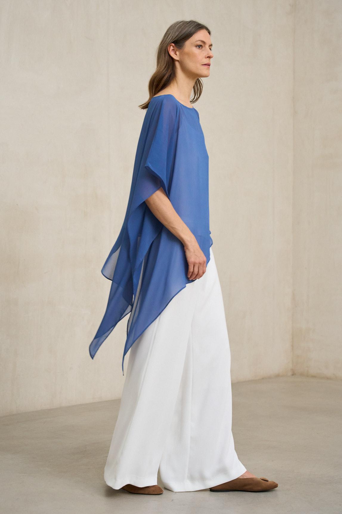 La Blusa Ilara azul acero es una prenda fluida de líneas limpias que destaca por su diseño asimétrico y su caída ligera. Confeccionada en tejido suave y vaporoso, presenta escote redondeado y manga corta amplia que aporta movimiento y comodidad.