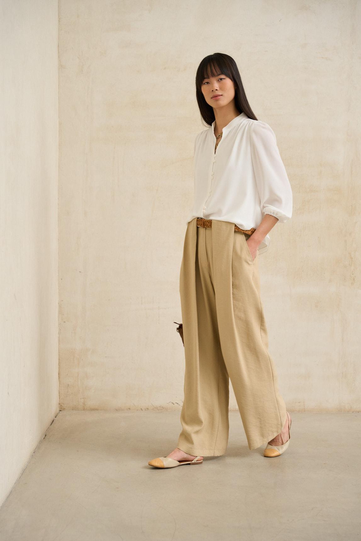 El tono blanco aporta luminosidad y frescura, integrándose con facilidad en estilismos neutros junto a arena, camel, verde oliva o negro. Es una prenda versátil que funciona tanto en looks de oficina relajada como en conjuntos más cuidados para eventos informales. Una camisa elegante y atemporal que equilibra sencillez y detalle con naturalidad.