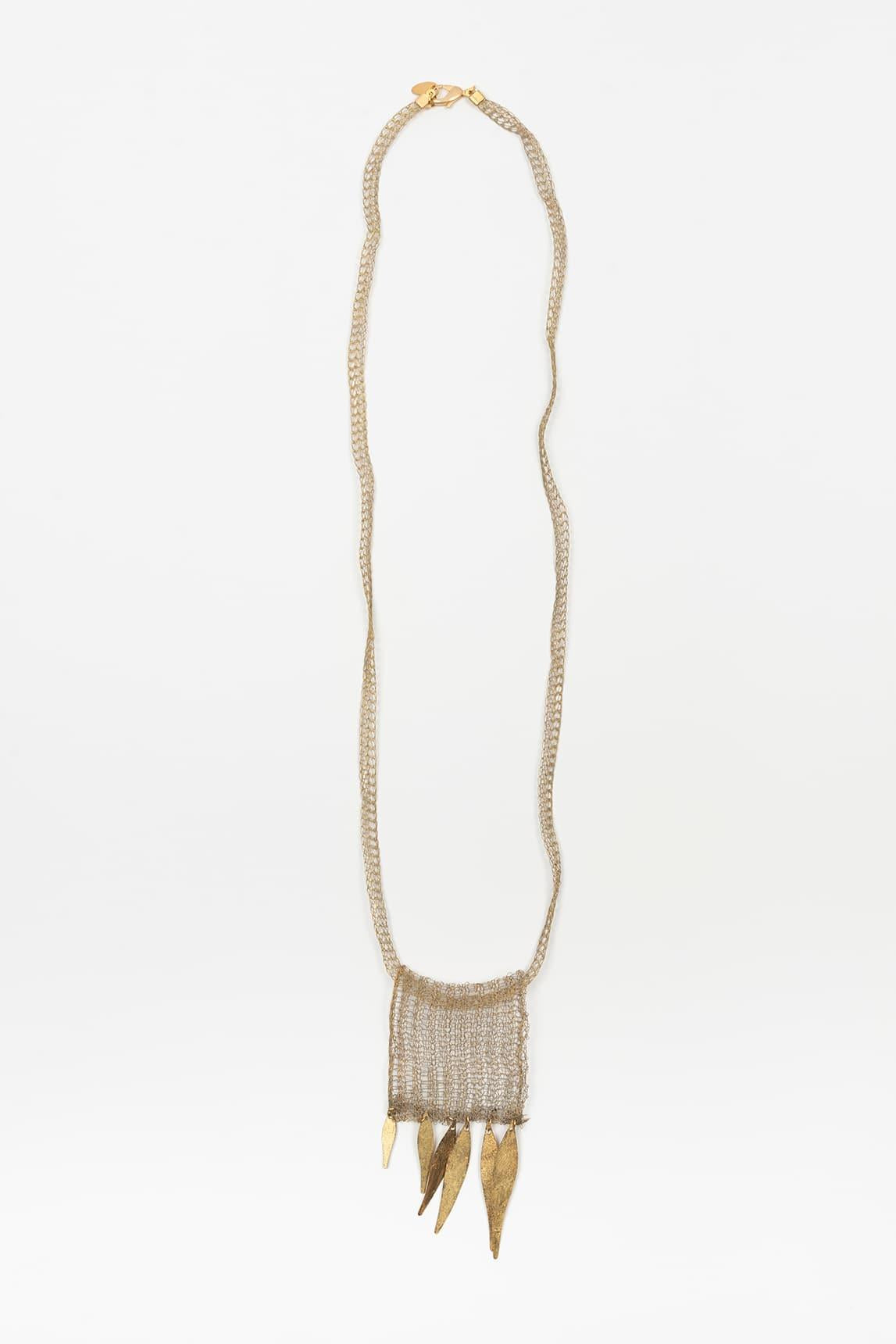 The Zafiria necklace stands out for its long and stylized design with a central composition of multiple fine chains falling vertically, topped with small triangular pieces that provide dynamism and character. Its structure combines delicacy and presence in a balanced and contemporary silhouette.