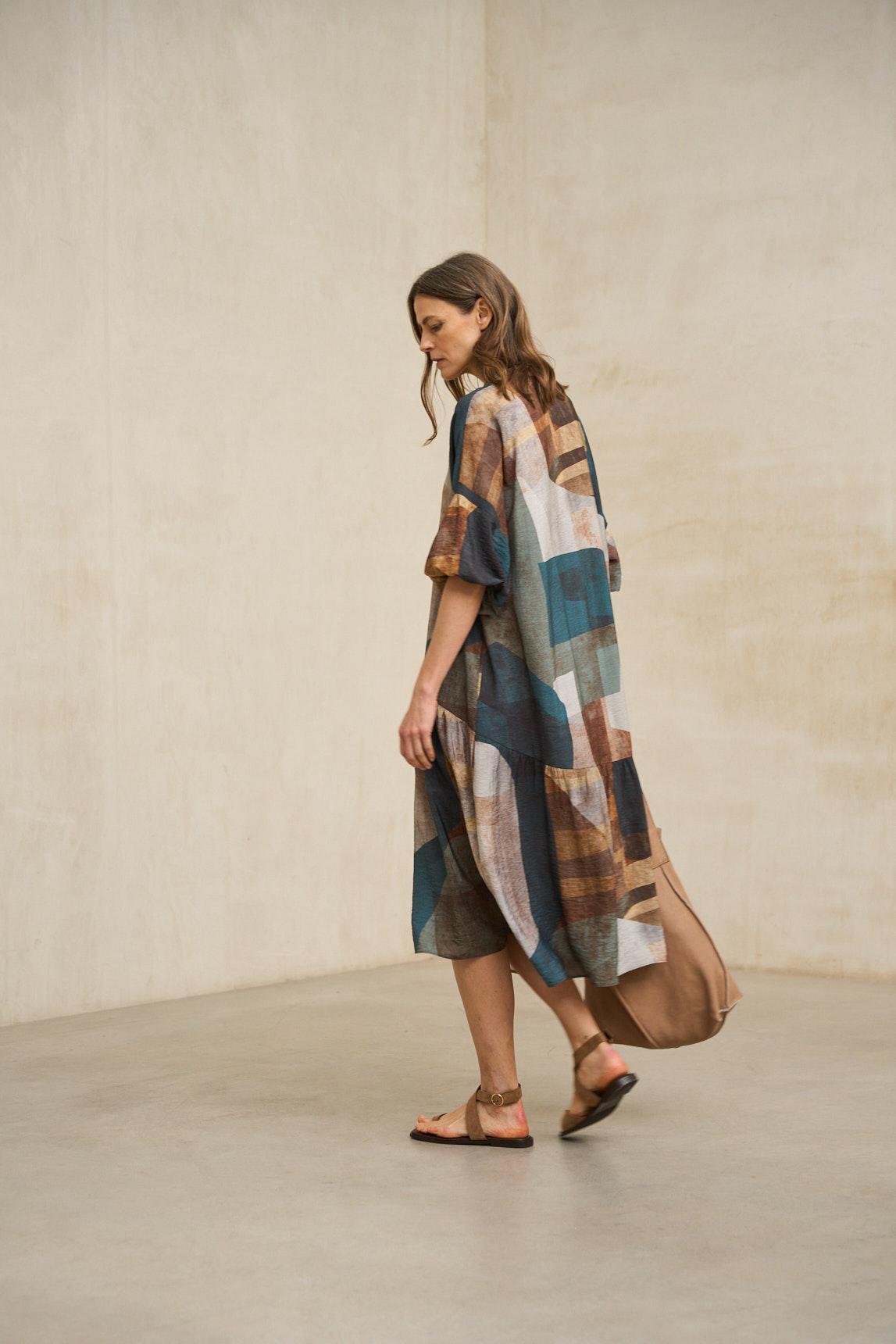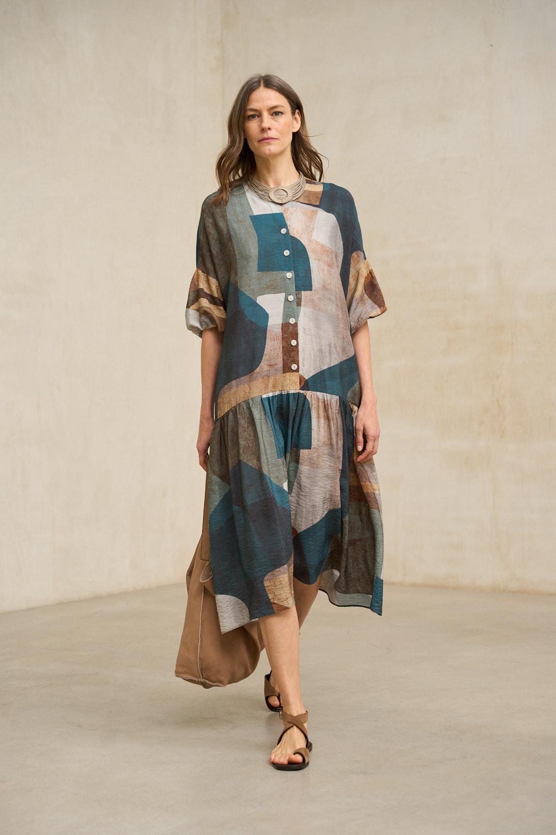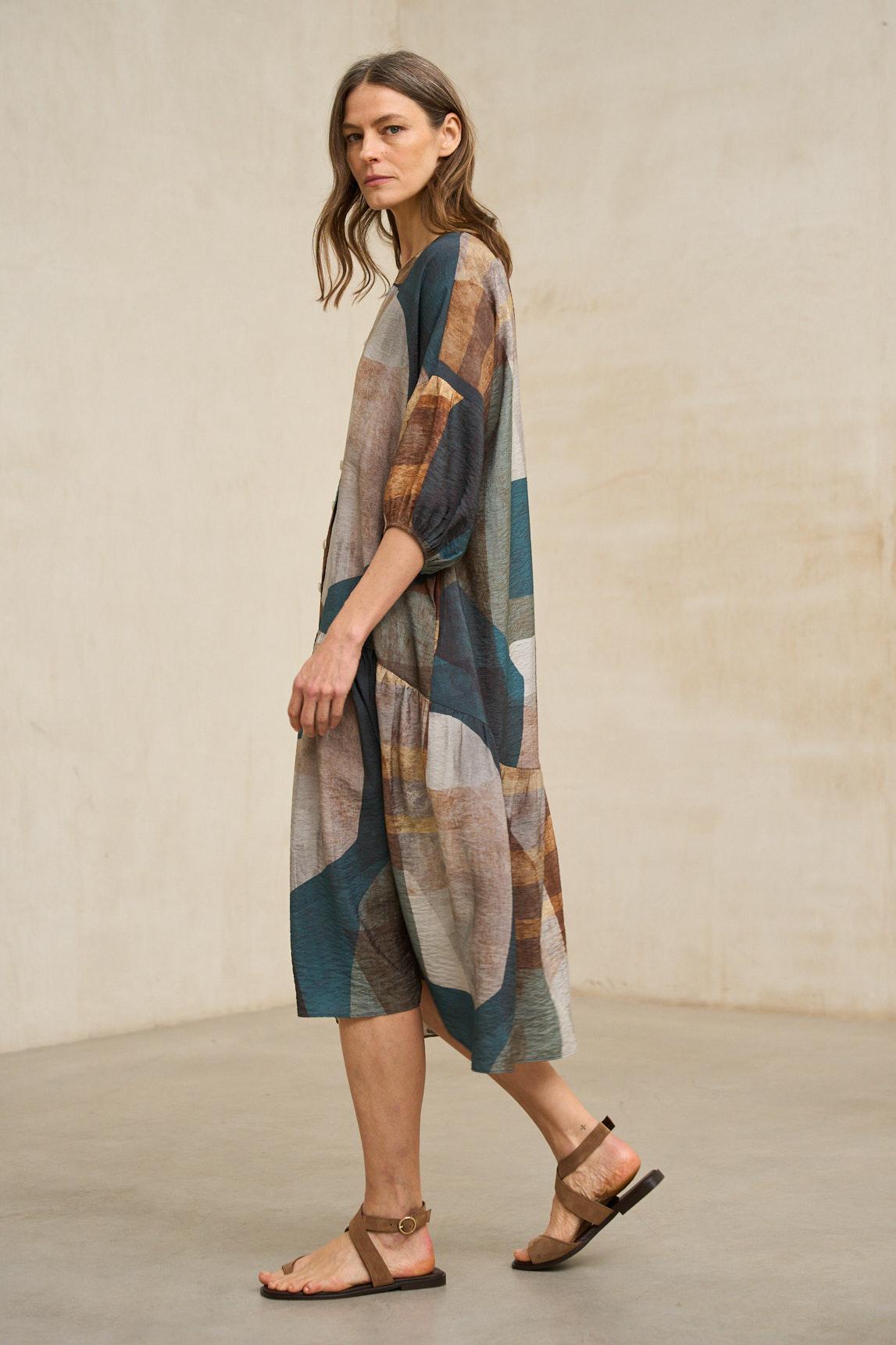 O vestido Elvina, com o seu estampado abstrato, destaca-se pelo design fluído e pela interação cromática de tons verdes, azul petróleo e terra sobre uma base clara. A sua silhueta solta e reta confere movimento e leveza, criando um fitting natural que favorece a figura sem restringir os movimentos.