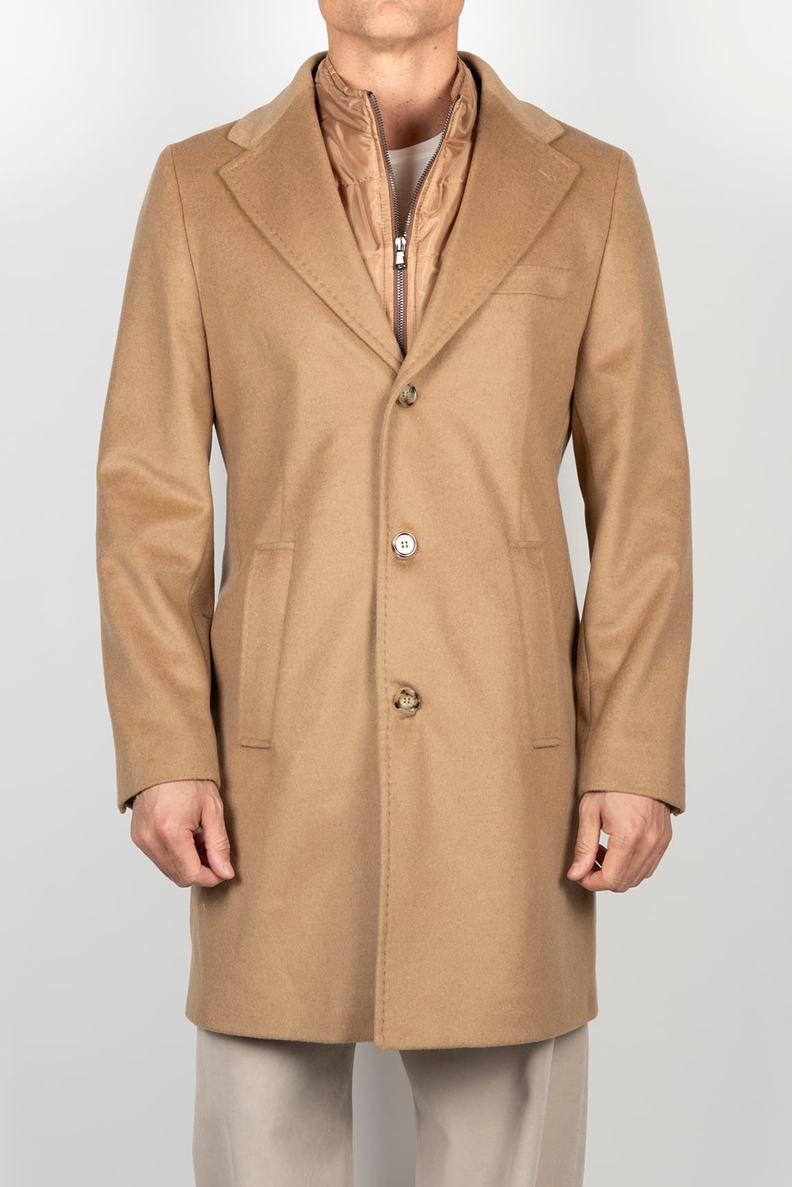 - Abrigo de hombre en tono camel confeccionado en tejido de tacto suave.