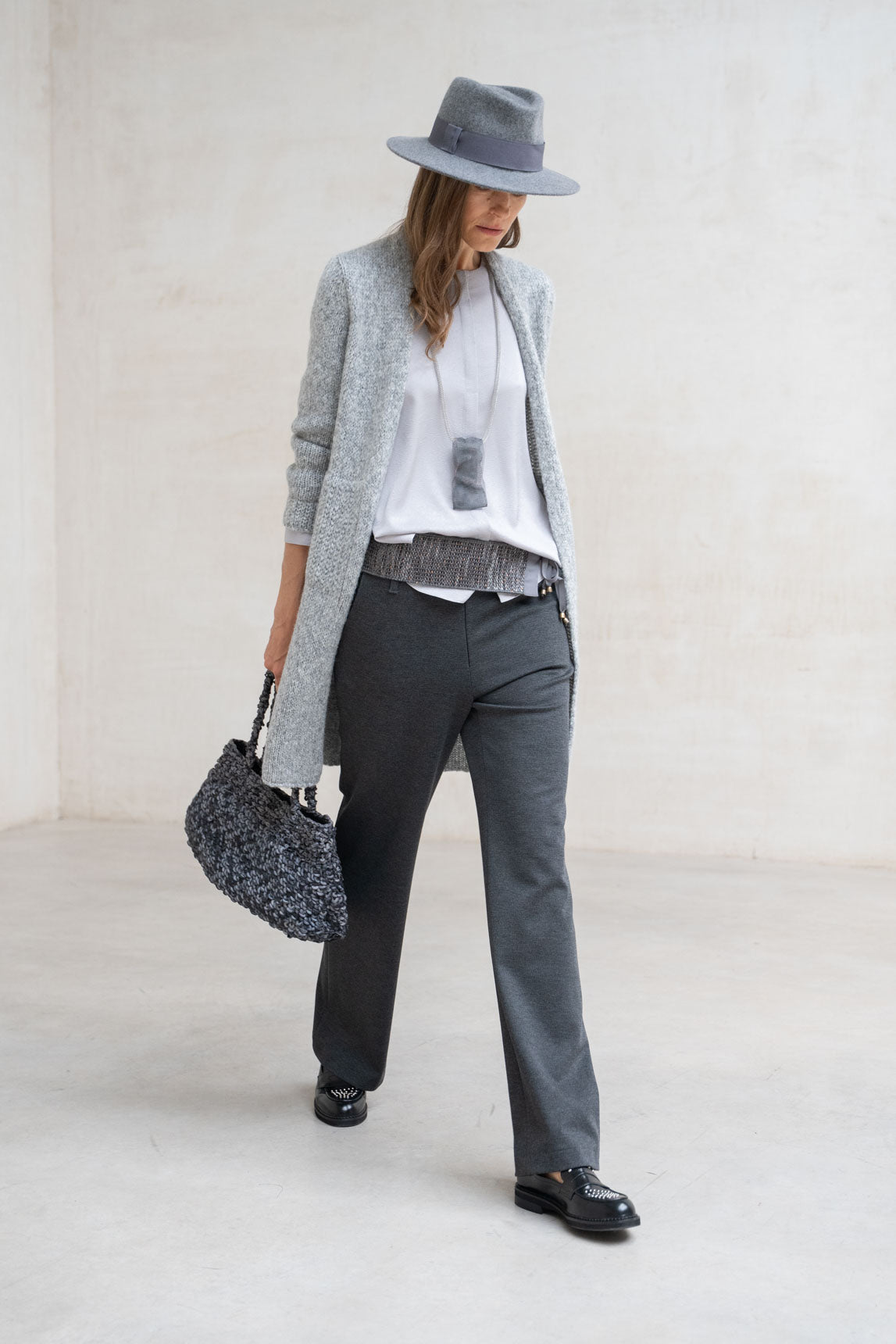 - Tecido de malha macia com acabamento em lamê cinza pérola.