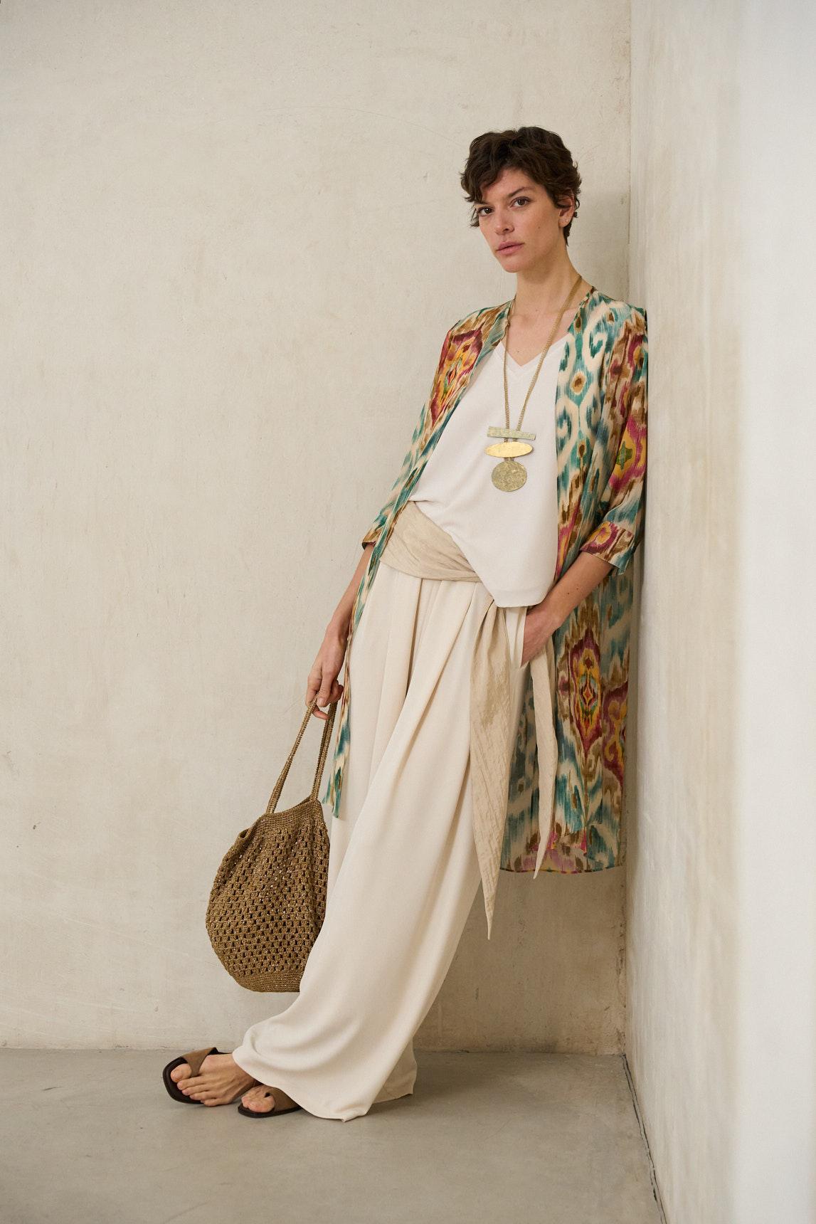 El Levita Azenia estampado multicolor es una prenda ligera y fluida diseñada para aportar color y movimiento al look. Su silueta abierta, sin cierre, cae con naturalidad desde los hombros, creando una línea vertical que estiliza la figura y aporta dinamismo. El tejido ligero se mueve con suavidad, mientras que el estampado geométrico en tonos verdes, tejas y matices cálidos aporta un carácter vibrante pero equilibrado. La manga amplia refuerza su aire relajado y lo convierte en una pieza cómoda y versátil para entretiempo o verano. Ideal para llevar sobre conjuntos neutros —como pantalones crudos o vestidos lisos—, el kimono Azenia transforma estilismos sencillos en propuestas con personalidad. Es perfecto tanto para looks urbanos como para eventos informales donde se busca un toque distintivo sin perder elegancia. Nos esforzamos por mostrar los colores de la forma más fiel posible, pero pueden variar ligeramente respecto a la realidad.
