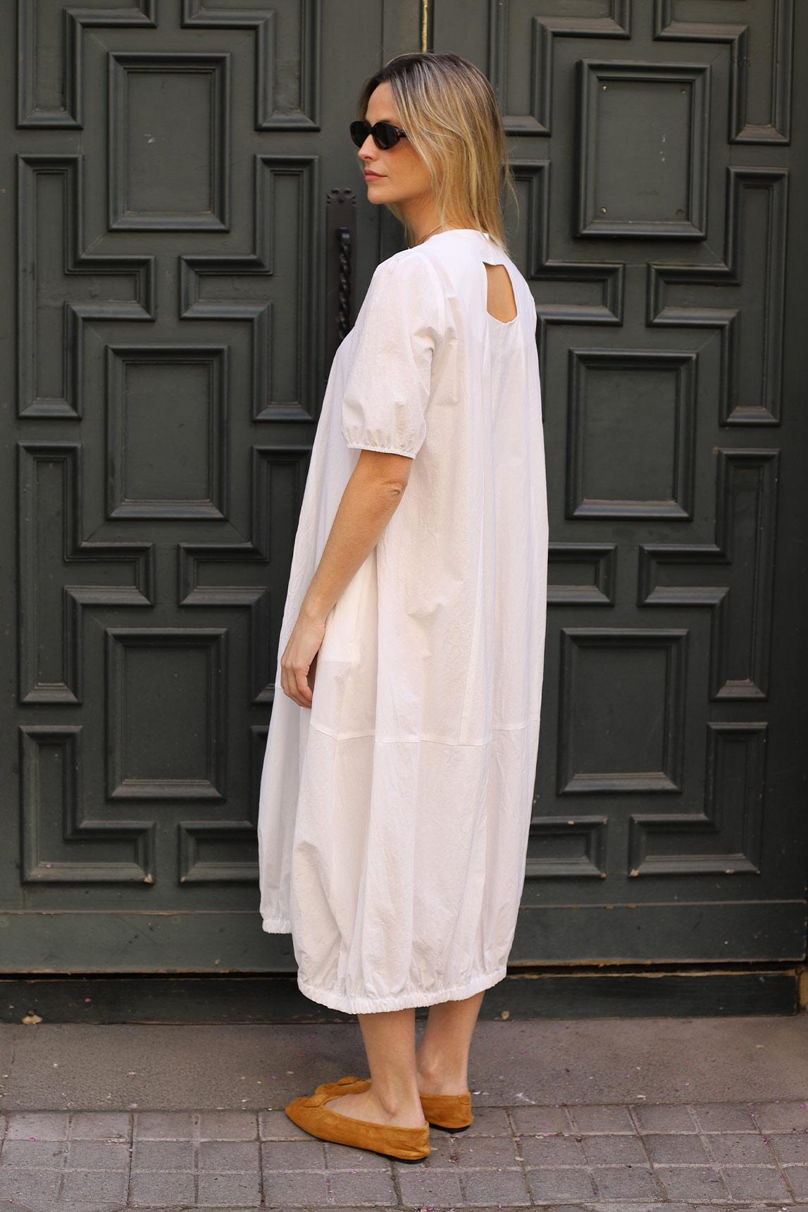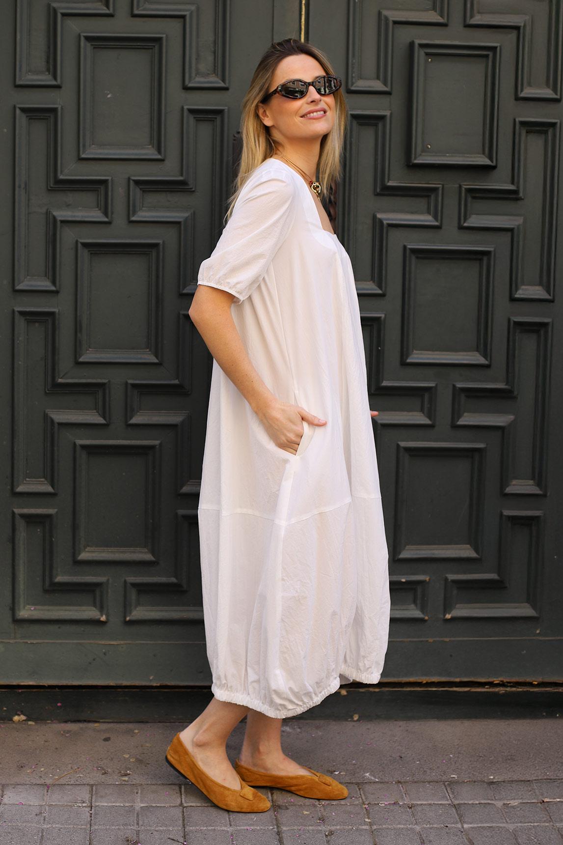 Women's dress in white with a square neckline, wide short sleeves, and a soft voluminous silhouette. The design features a clean and ample line that drapes lightly and finishes in a balloon hem with elastic, providing movement, shape, and a very modern visual presence. Integrated side pockets add functionality to the ensemble without disrupting the clean aesthetic, while the smooth finish reinforces its luminous and sophisticated character.