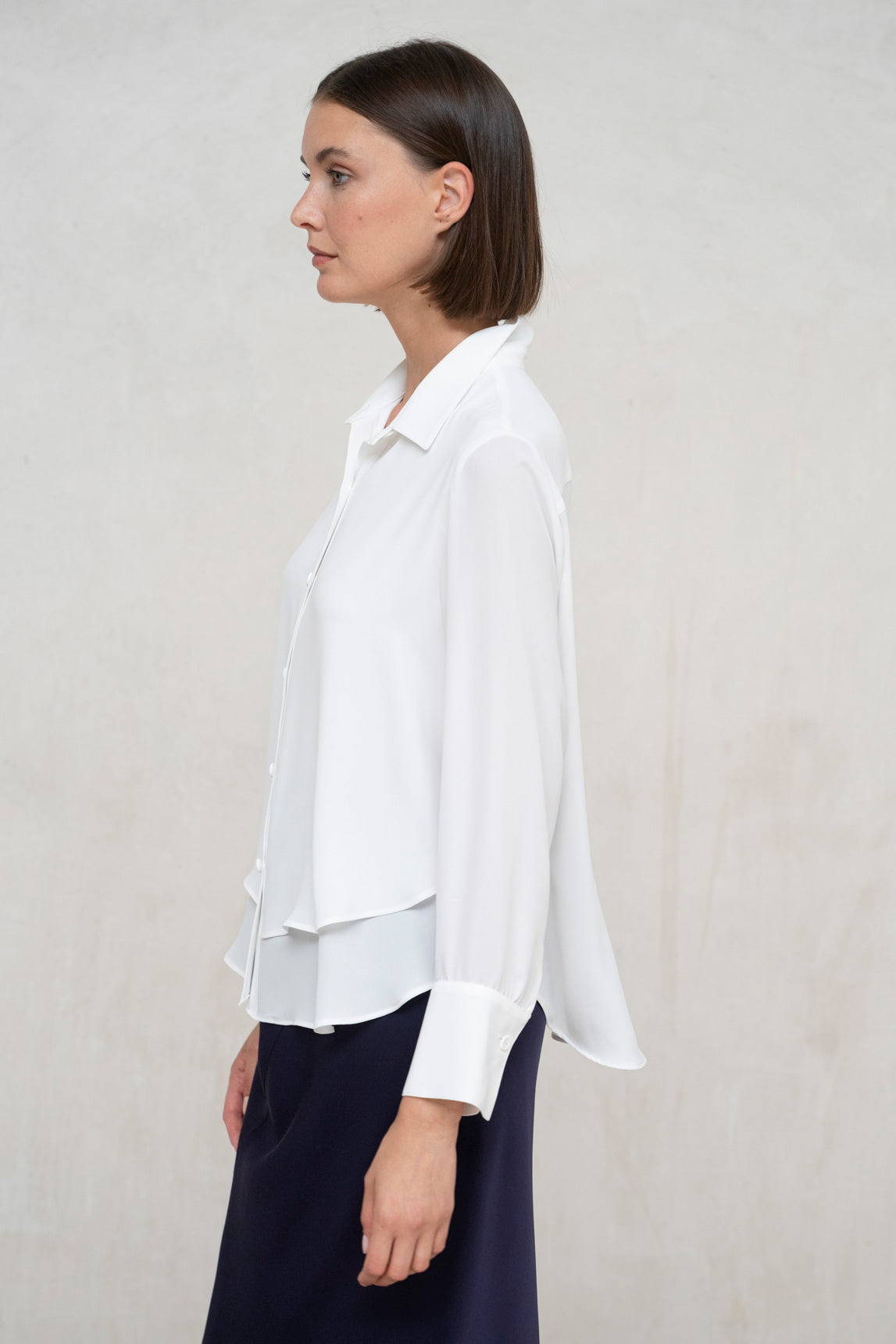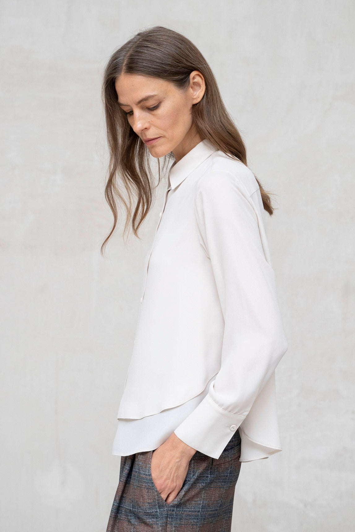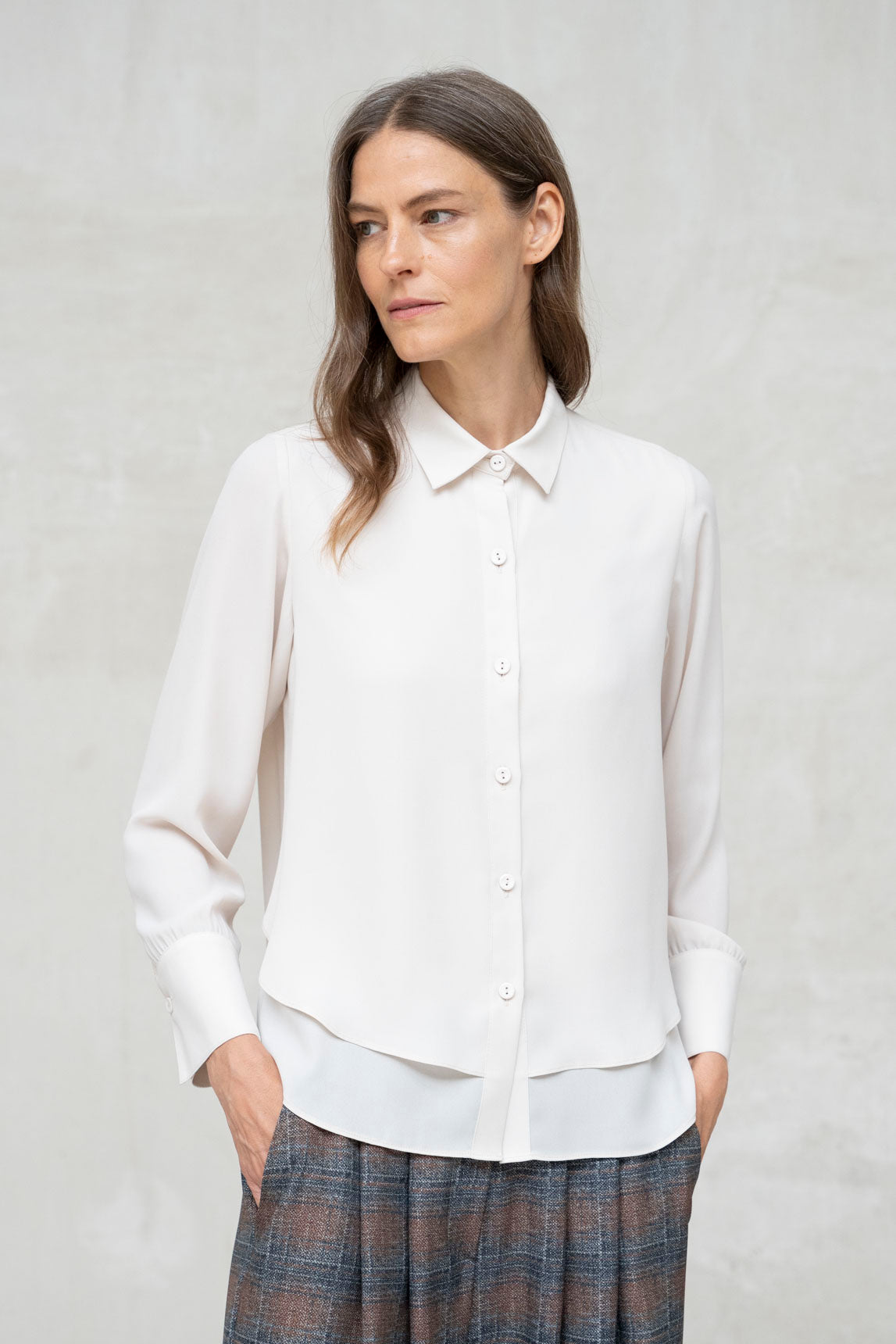 A blusa Como em cru é uma peça versátil e sofisticada. A sua bainha dupla acrescenta um toque visual sem ser exagerada, e o tecido fluido torna-a perfeita tanto para looks de escritório como para looks casuais chiques com jeans ou saias.