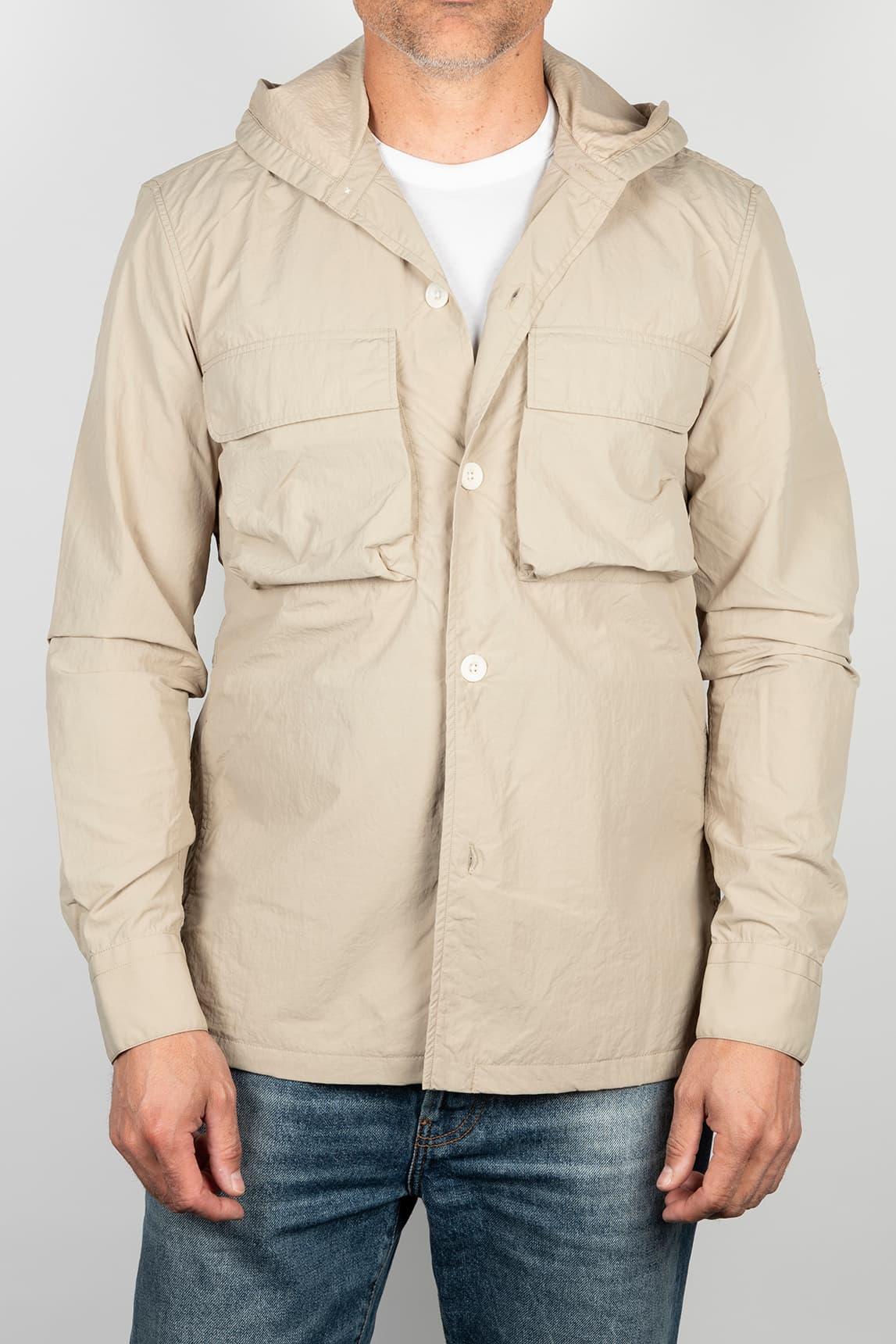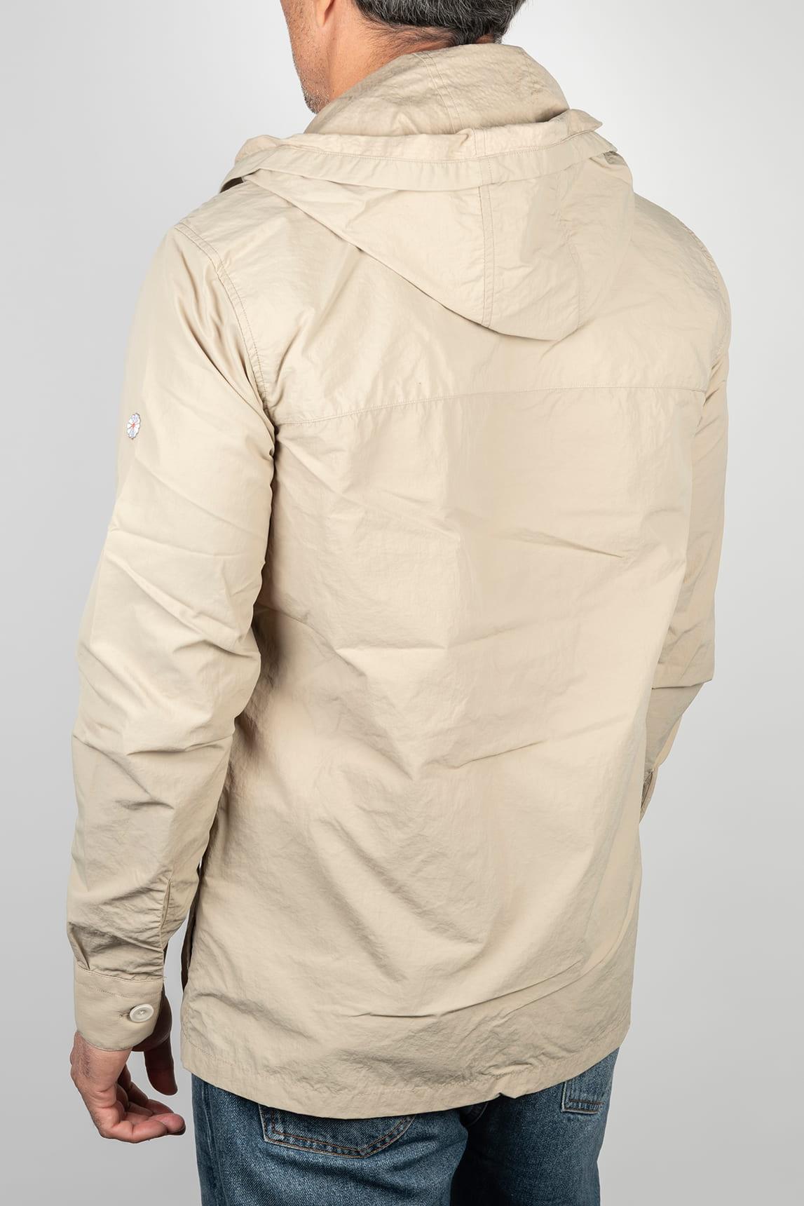 Men's beige jacket with integrated hood, straight silhouette, and utilitarian-inspired design. It features a visible button front closure, long sleeves with simple cuffs, and front patch pockets with flaps, reinforcing its functional and relaxed character. The surface has a smooth, lightweight appearance, providing a clean and balanced look that is easy to combine.