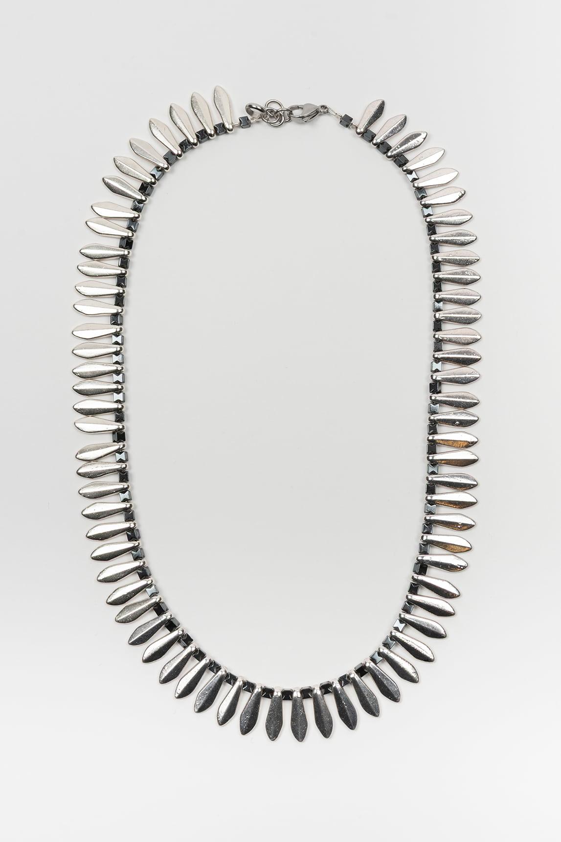 O colar Aurelis em prata destaca-se pelo seu design estruturado e contemporâneo, composto por uma sucessão contínua de peças alongadas que criam um efeito rítmico e envolvente em torno do pescoço. A sua silhueta definida confere personalidade sem sacrificar a elegância.