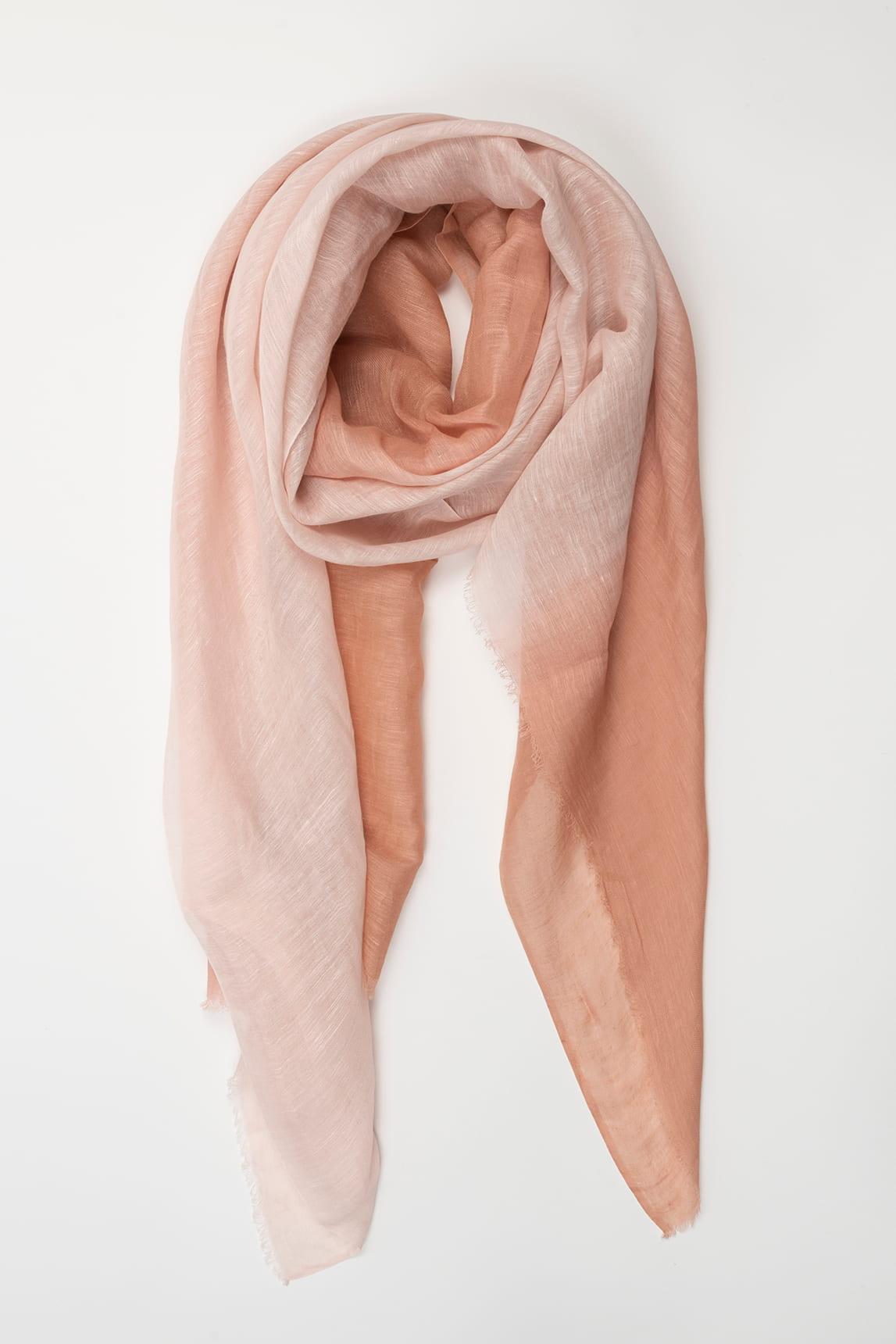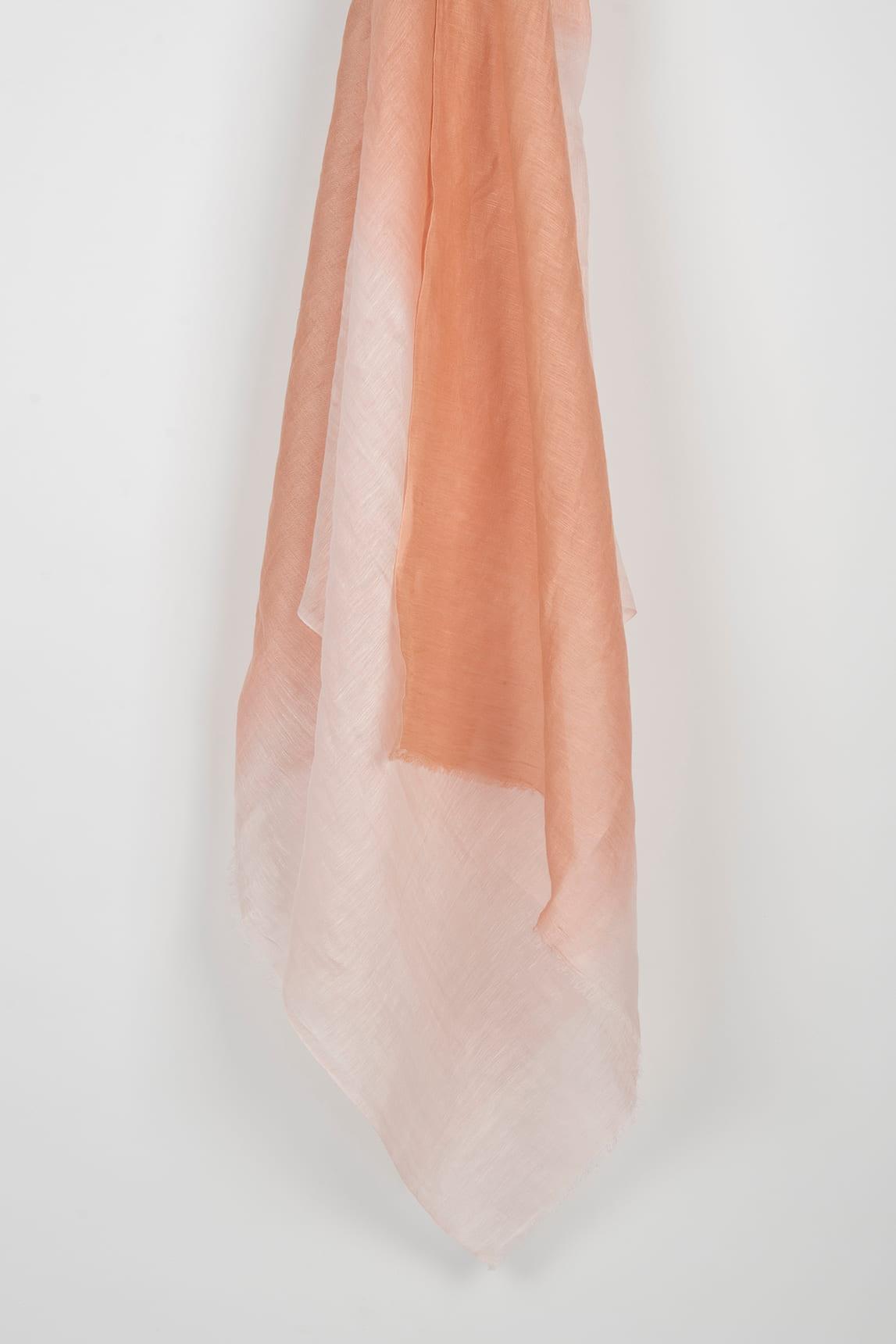 Fular de mujer confeccionado en una mezcla natural de 70 % lino y 30 % algodón. Su tejido ligero y vaporoso combina la frescura del lino con la suavidad del algodón, ofreciendo una textura agradable y transpirabilidad durante los meses cálidos. Presenta un degradado en tonos melocotón que aporta luminosidad y un toque artesanal.
