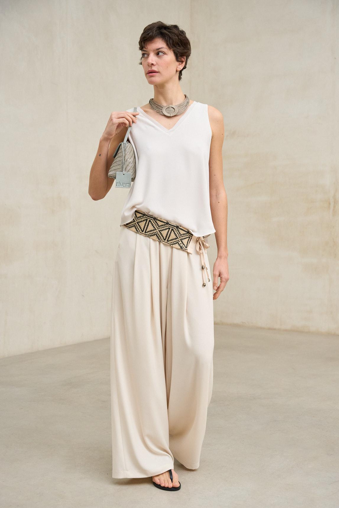Este top sin mangas presenta una silueta amplia y ligera, definida por un escote en pico tanto en el delantero como en la espalda, que estiliza la parte superior y aporta una línea limpia y equilibrada. El tejido ofrece una caída fluida y continua, con un acabado liso que potencia la sensación de suavidad y movimiento. El bajo ligeramente redondeado refuerza su carácter relajado, mientras que el corte suelto permite que la prenda acompañe el cuerpo sin ajustarse.